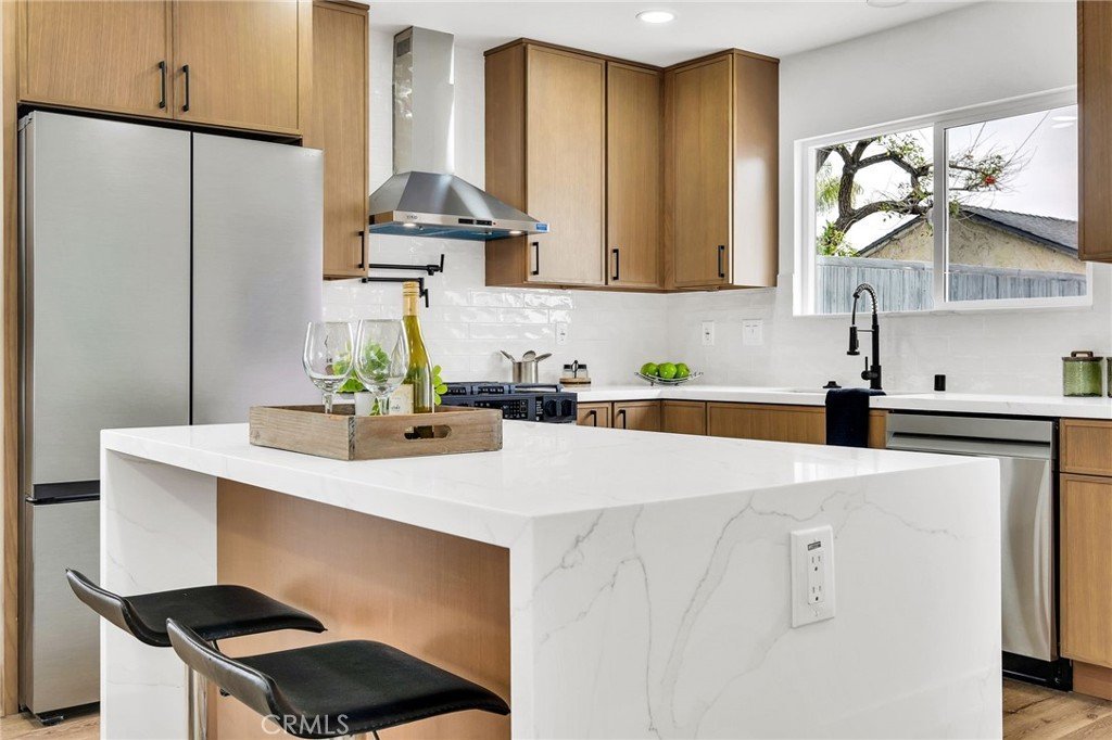 The spacious living room is bathed in natural light from oversized windows, showcasing brand-new flooring and fresh neutral paint throughout. The fully renovated kitchen is truly a chef’s dream, featuring sleek countertops, new stainless steel appliances, custom cabinetry, and a stunning island perfect for meal prep, casual dining, or gathering with friends and family.