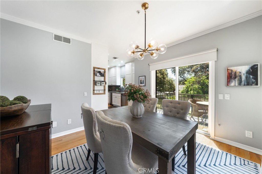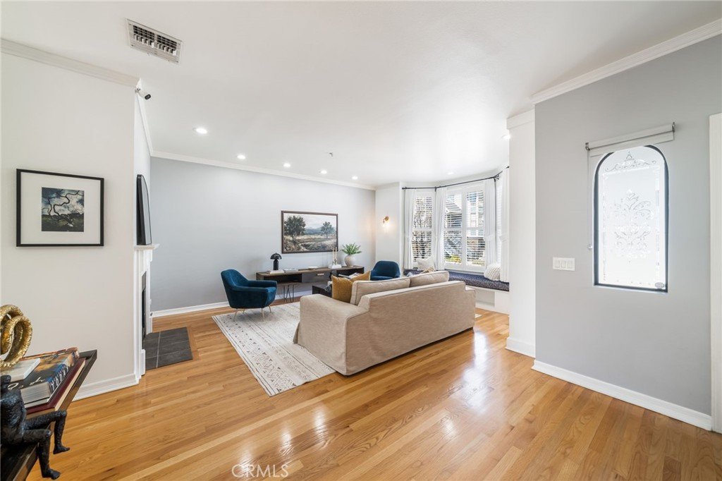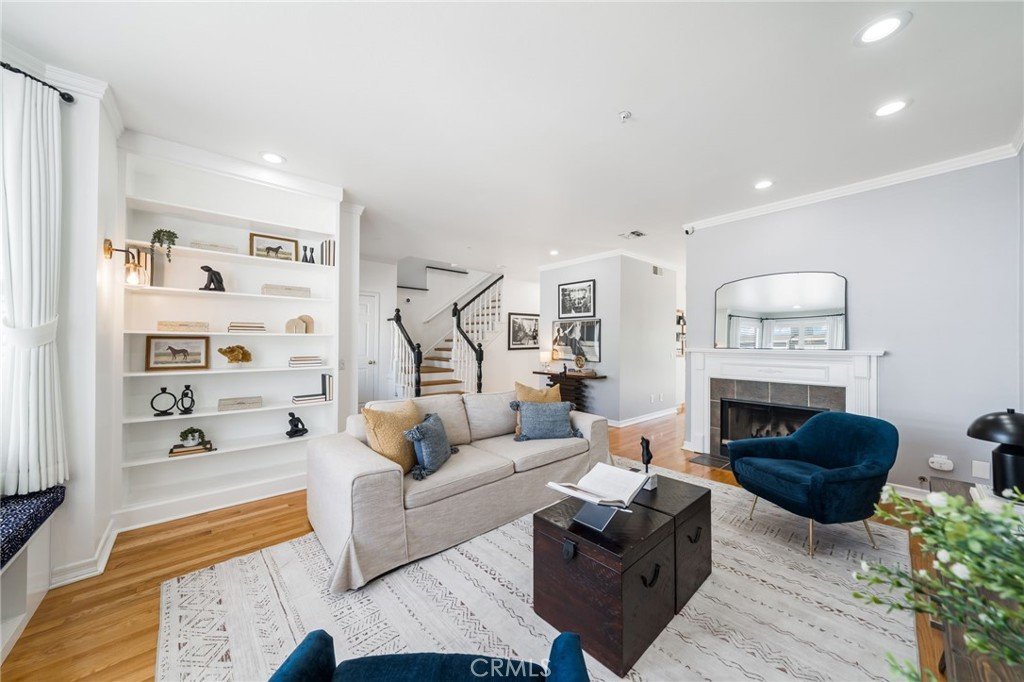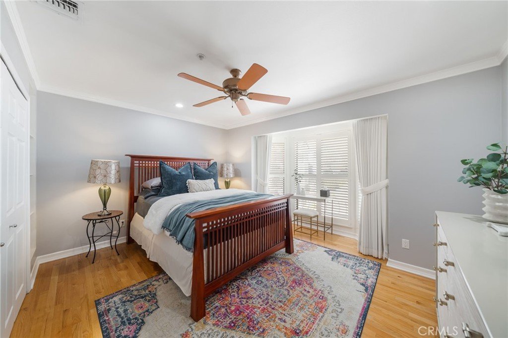 The welcoming main level features a spacious living room with fireplace, plantation shutters, and abundant natural light. The inviting dining area showcases picturesque bay windows and custom built-in cabinetry, creating an ideal space for entertaining. The kitchen offers tall cabinetry, generous pantry storage, and designer countertops. A sliding glass door opens to a private deck that leads down to a fully enclosed backyard—perfect for relaxing or enjoying Southern California’s indoor-outdoor living.