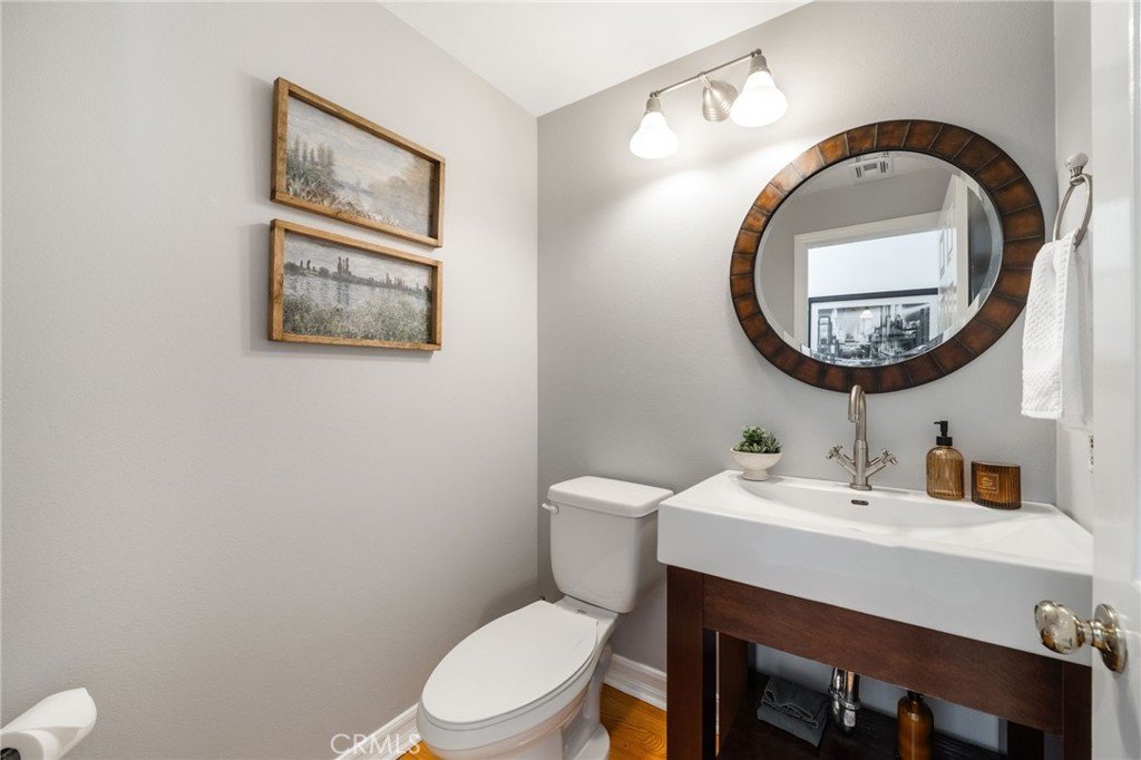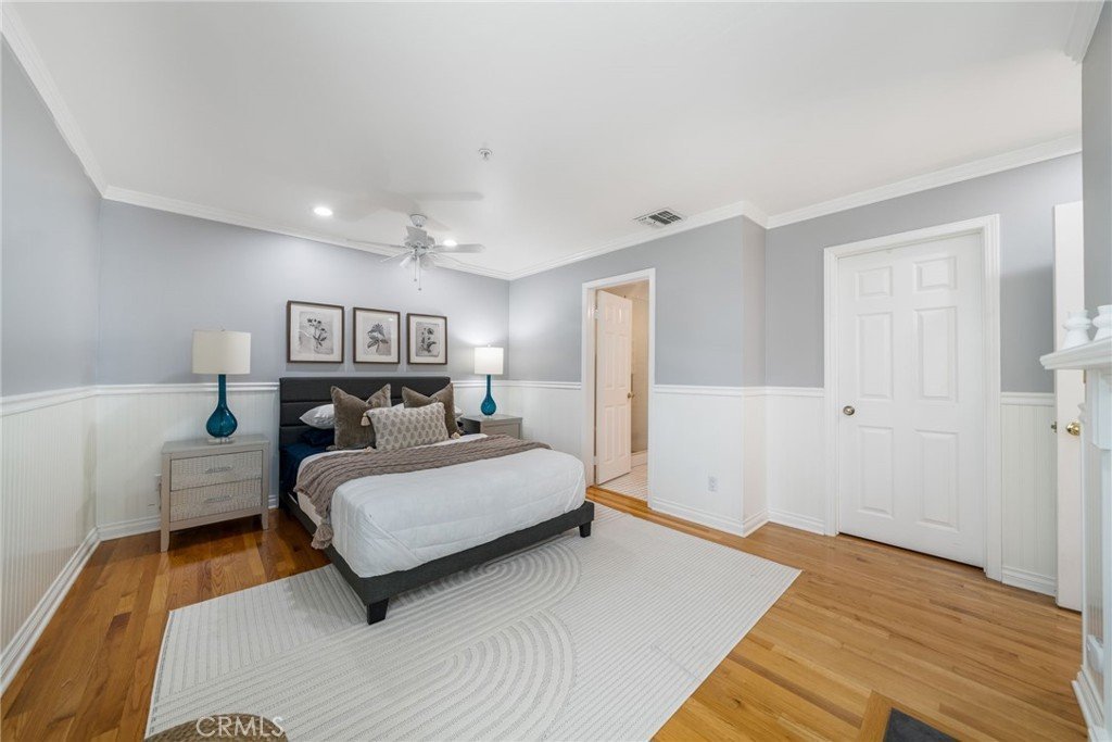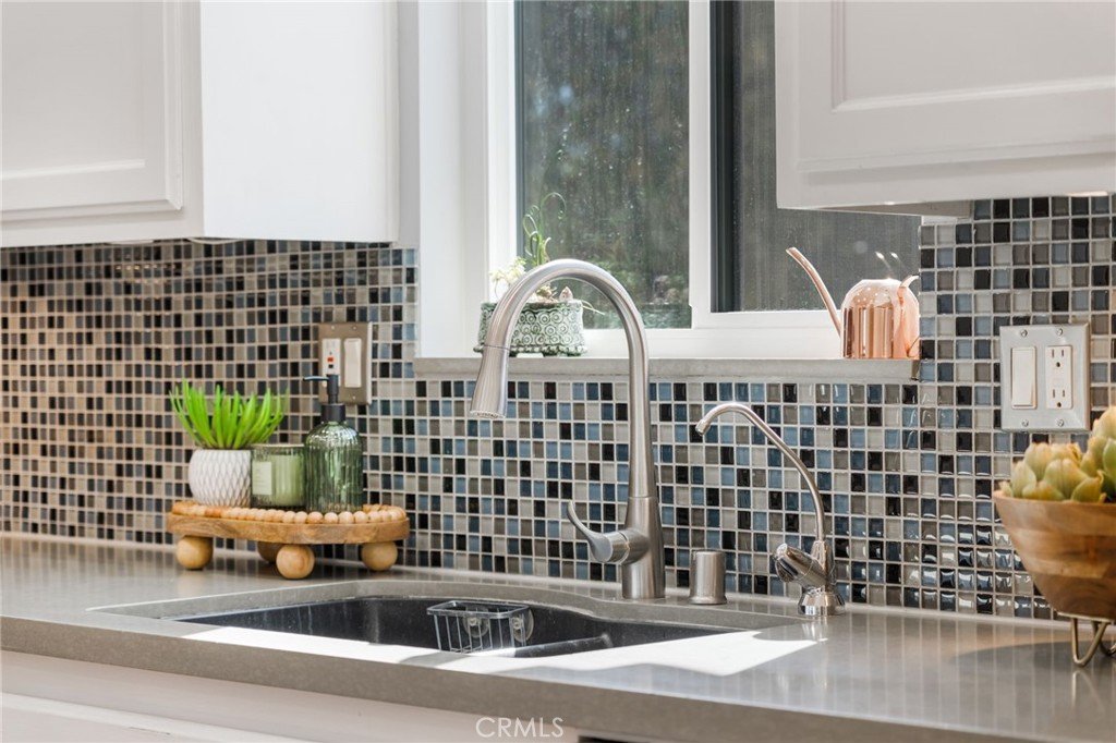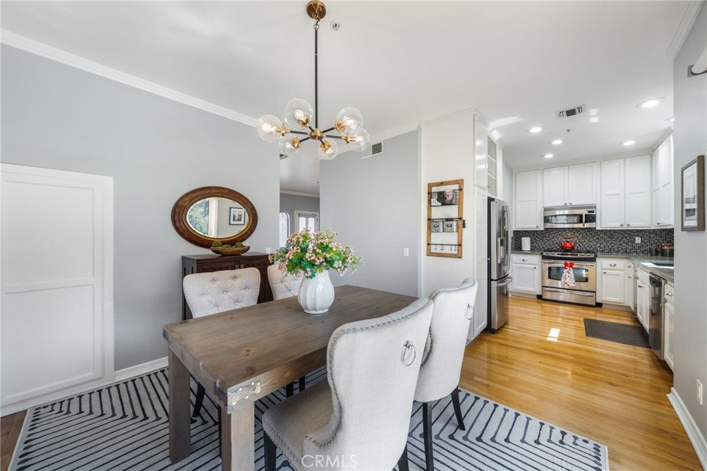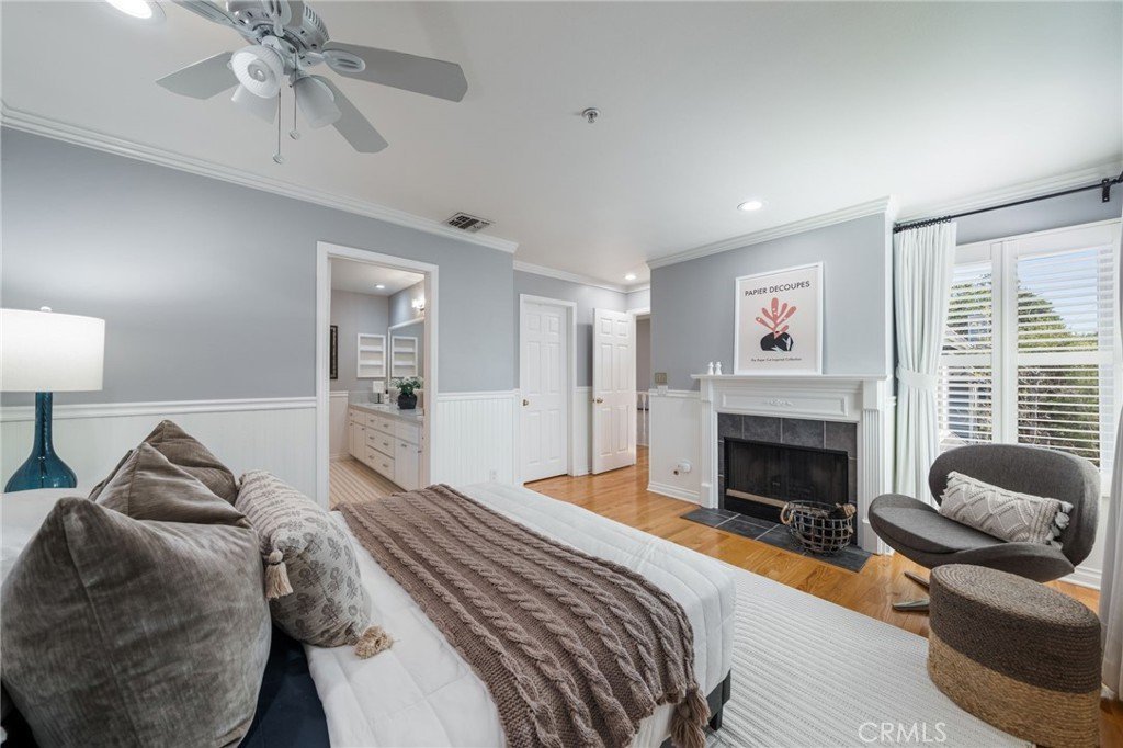 The welcoming main level features a spacious living room with fireplace, plantation shutters, and abundant natural light. The inviting dining area showcases picturesque bay windows and custom built-in cabinetry, creating an ideal space for entertaining. The kitchen offers tall cabinetry, generous pantry storage, and designer countertops. A sliding glass door opens to a private deck that leads down to a fully enclosed backyard—perfect for relaxing or enjoying Southern California’s indoor-outdoor living.