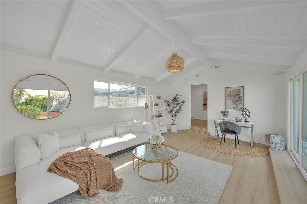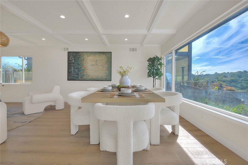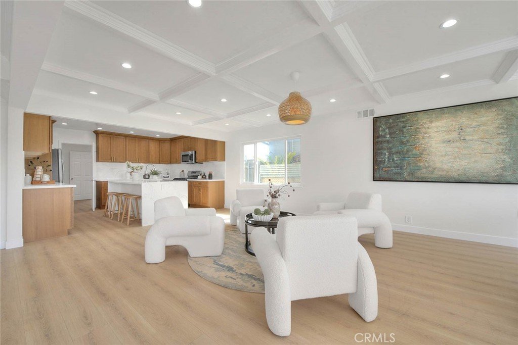 Fully renovated from top to bottom, the home showcases brand-new flooring, modern bathrooms, a completely upgraded kitchen with new cabinetry, a new roof, fresh interior and exterior paint, and newly designed landscaping. Upon entry, you’re welcomed by elegant coffered ceilings that enhance the home’s bright, open, and refined atmosphere.
