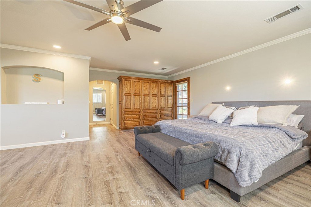 The backyard is an entertainer’s dream with lush landscaping, a private patio with a fan, and an Internet ready Log Cabin with its own mini split unit. It will be perfect for a studio, home office, or a playroom for the kids. The fully fenced yard is also wide open with room for a future pool or a fire pit. Extras include a huge 30x25 garage, RV parking with dump station and 30-amp hookup, two new water heaters, and a circular driveway with dual electric gates.
