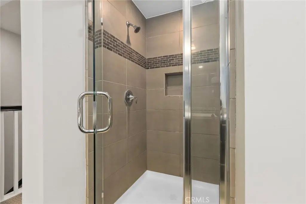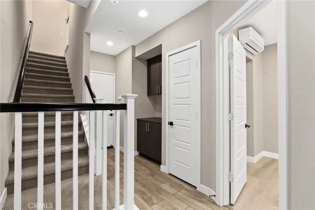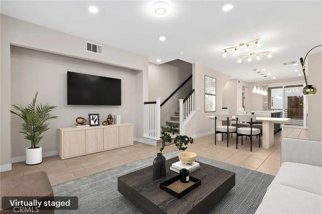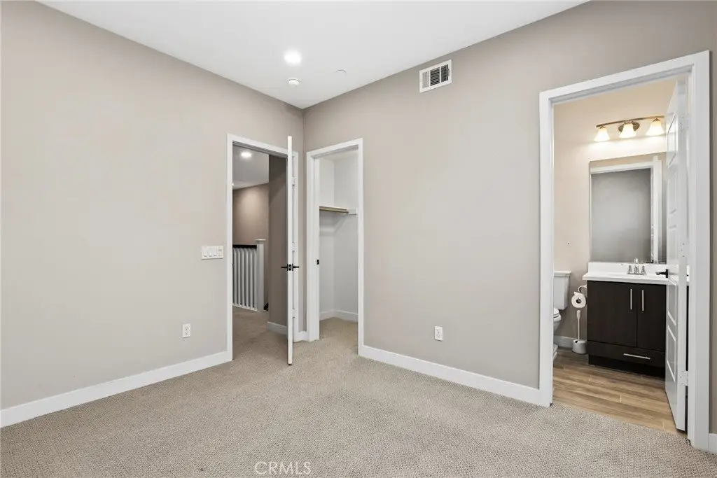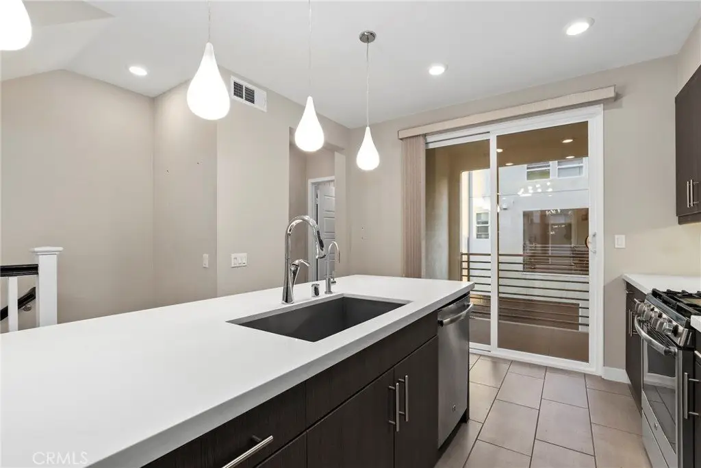 Experience modern comfort and style in this stunning tri-level home featuring 3 bedrooms, each with its own private bathroom—including a first-floor suite ideal for in-laws or guests. Enjoy energy-efficient mini-split A/C on the first floor, abundant natural light, tile flooring, recessed lighting, and Levolor zebra blinds throughout the main levels. The open-concept kitchen is a showstopper with stainless steel appliances, quartz countertops, sleek contemporary cabinetry with underlighting, a gas stove, built-in microwave, dishwasher, stylish backsplash, storage island, modern pendant lighting, pantry, and sliding doors leading to a covered balcony—perfect for relaxing or entertaining. Upstairs, the primary bedroom impresses with ample closet space and an elegant en suite boasting a dual-sink vanity, water closet, custom tilework, and glass-enclosed shower. A second upper-level bedroom provides comfort and privacy with its own en suite and spacious closet. Additional highlights include an attached 2-car garage with motion lights and a 220V 14/50 EV charger, guest parking inside the gated community, top-floor laundry, tankless water heater, whole-house water softener, 7-stage reverse osmosis filtration system, humidity-sensor exhaust fans, enhanced sound insulation, premium Moen and Kohler fixtures, and custom built-ins.