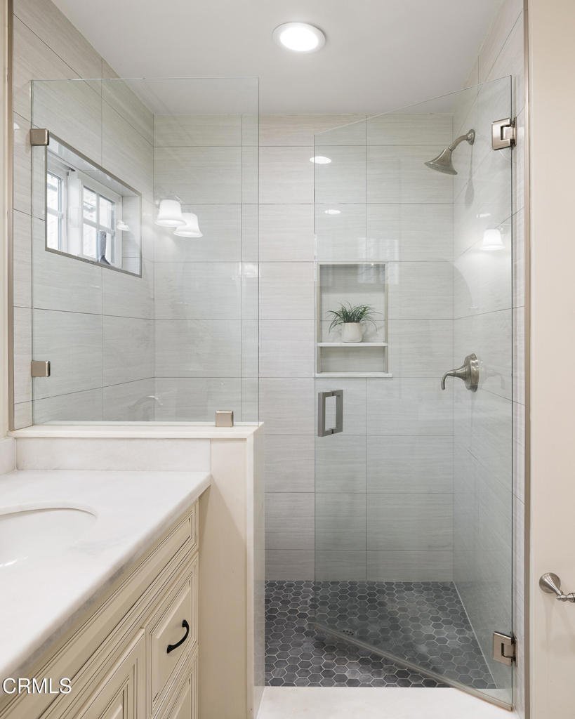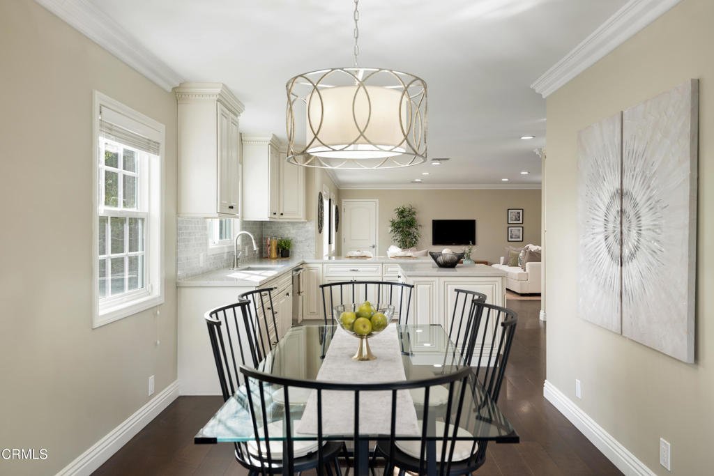 Ideally located in the sought-after foothills of La Canada Flintridge, this charming corner-lot home combines timeless appeal with thoughtful updates. Impeccable curb appeal welcomes you with manicured landscaping, a mature shade tree complete with a classic rope swing & a winding flagstone pathway leading to the covered front porch. Inside, hardwood flooring & crown molding set a warm tone in the light-filled living room. A corner gas fireplace with an oversized mantel anchors the space, while recessed lighting & a large picture window overlook the lush front yard. The open layout flows into the dining room, highlighted by another expansive window & a stylish designer chandelier, perfect for gatherings both intimate & grand. The remodeled kitchen is a true centerpiece, featuring stone countertops, a custom-tiled backsplash, recessed lighting, crown molding & a premium stainless Viking Professional appliance suite, including a six-burner range & oven, range hood, refrigerator, freezer & dishwasher. The kitchen opens seamlessly to a spacious family room with recessed lighting & crown molding, creating an ideal setting for everyday living & entertaining. Direct access to the attached two-car garage & additional storage enhances convenience. The bedroom wing offers comfort & privacy. Two secondary bedrooms feature hardwood floors, crown molding, dual-pane windows & mirrored closet doors. A full hallway bathroom includes a deep soaking tub & shower combination, an oversized stone-topped vanity & elegant finishes. A whole-house fan provides added efficiency. A dedicated laundry area with a side-by-side washer & dryer is tucked behind louvered doors. A versatile third bedroom, currently used as an office, offers generous closet space & a sliding door leading to the backyard. At the rear of the home, the primary suite serves as a serene retreat with crown molding, a ceiling fan & French doors opening to the patio. The ensuite bath is beautifully updated with basket-weave tile flooring, a dual-sink stone vanity, recessed lighting & a custom glass-enclosed shower with bench seating & tile extending to the ceiling. Outdoors, the backyard is designed for both relaxation & entertaining, featuring a pergola-covered patio with a built-in barbecue island, a grassy yard & raised garden beds. Located in a wonderful neighborhood close to excellent schools, local dining, & shopping, this La Canada home offers comfort, quality, and lifestyle in one exceptional setting.
