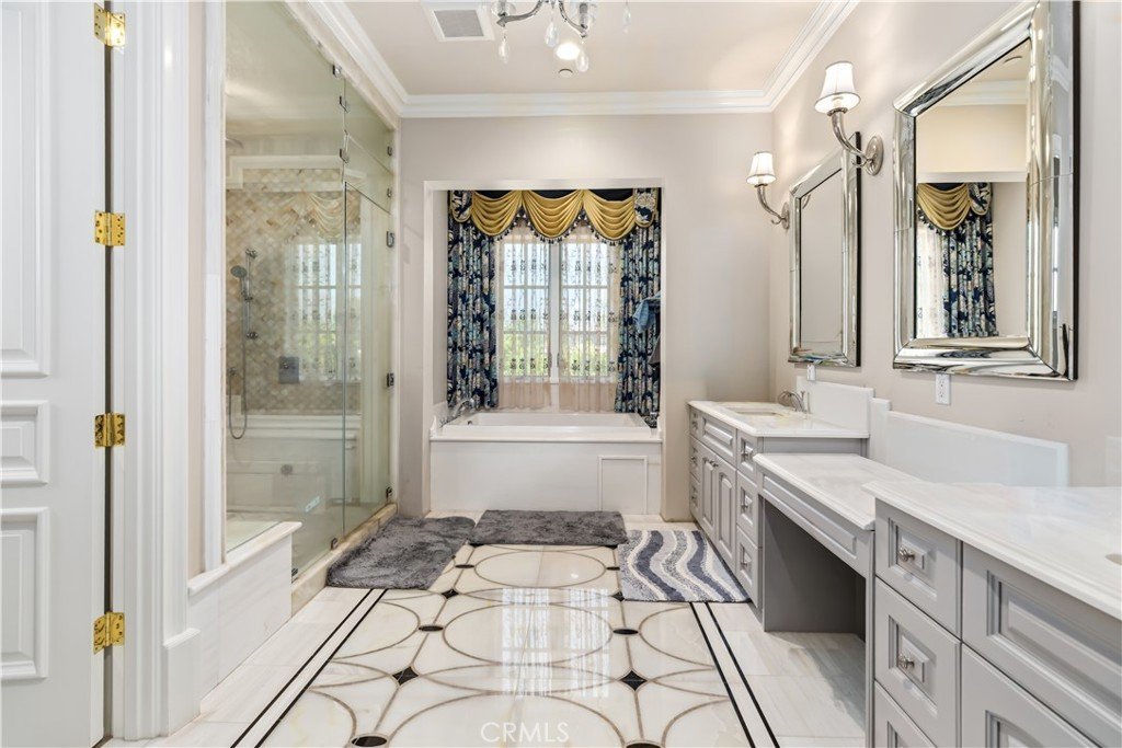 ARCADIA SCHOOL DISTRICT!!! Presenting an exceptionally refined and highly desirable South-facing French Chateau estate, meticulously designed by renowned architect Mr. Robert Tong and custom built in 2017. Set on a generous 22,234 sq. ft. lot, this remarkable residence offers approximately 8,108 sq. ft. of thoughtfully planned living space and delivers the perfect balance of grandeur, privacy, and everyday comfort—an ideal choice for families who value both top-tier education and a true luxury lifestyle. From the moment you enter, you are welcomed by a distinctive, elegant interior featuring generous high ceilings, tasteful recessed lighting, and tall windows throughout, creating a bright, airy atmosphere with an upscale European feel. The home showcases custom detailed marble flooring and refined Mahogany hardwood floors, complemented by exquisite millwork including magnificent crown molding ceilings, and a sophisticated blend of classic luxury and modern functionality. Designed for impressive hosting and seamless flow, the residence features a stunning two-story foyer with an exquisite semi-circular grand staircase crafted from premium Mahogany, enhanced by a solid and unique cast iron railing, creating a centerpiece worthy of a grand estate. The heart of the home is a chef-inspired gourmet kitchen equipped with top-of-the-line stainless steel appliances, granite countertops, and a charming breakfast nook, offering both refined elegance and practical space for family meals. The dining area opens to abundant natural light, making every gathering feel warm and inviting. y. The master suite serves as a true retreat, offering his-and-her walk-in closets, a relaxing retreat area, and a deluxe master bath featuring a luxurious jacuzzi bathtub, a separate shower, and a steam shower—perfect for unwinding after a full day. A spacious observation balcony further elevates the experience, providing a tranquil outdoor moment from the comfort of home. The backyard is beautifully designed for celebrations and family fun, featuring a saltwater pool with cascading waters that creates a serene, spa-like ambiance, while the surrounding fruit trees add refreshing natural aromas and a soothing atmosphere. With its prestigious Arcadia neighborhood, expansive entertaining spaces, premium craftsmanship, and family-focused comforts, this magnificent villa is truly a standout home—crafted for modern living, unforgettable hosting, and lasting enjoyment!