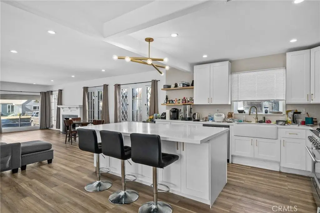 Step inside and experience the light-filled, open-concept floor plan featuring a modern chef’s kitchen. The kitchen shows off an oversized island, abundant storage, custom tile work, stainless steel appliances, and sleek shaker cabinets. The large living, dining, and sitting room combination creates a perfect flow for entertaining or relaxing, with a bonus space off the kitchen that's ideal for a play area or cozy retreat with large windows.