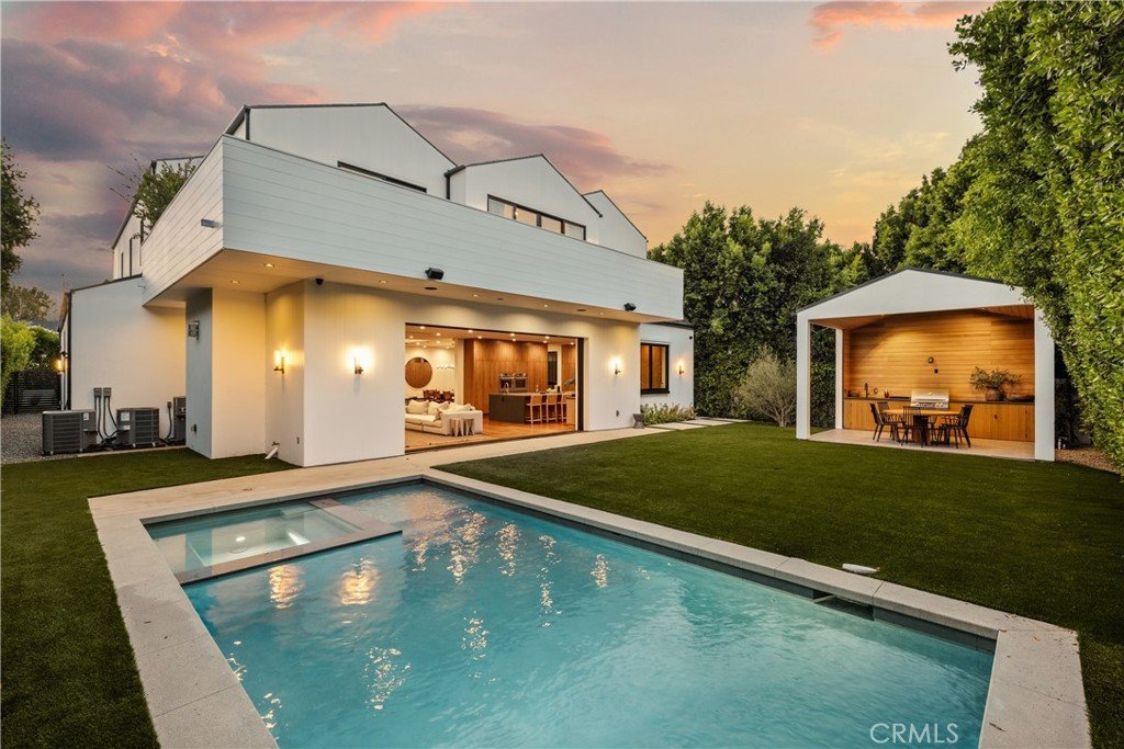 This awe-inspiring newer construction estate by JVE Development featuring refined design details by Jae Omar. Sits quietly on a cul-de-sac in the heart of Encino. A rare combination of striking architecture, thoughtful finishes, and a floor plan designed for both grand entertaining and everyday comfort, this home is the definition of modern luxury. Step inside to soaring ceilings and a seamless open layout accented with rich wood details. The living room centers around a sleek fireplace and opens through oversized disappearing pocket doors to the backyard, blurring the line between indoor and outdoor living. The custom chef’s kitchen is a true showpiece, complete with professional-grade appliances, an oversized waterfall island with seating, and a pass-through window for effortless outdoor dining. A butler’s pantry connects the kitchen to the elegant formal dining room, perfect for hosting dinner parties. Upstairs, four spacious ensuite bedrooms provide comfort and privacy. The primary suite is a true retreat, with a private balcony, wet bar, custom walk-in closet, and a spa-like bath featuring dual vanities, a soaking tub, and a glass-enclosed shower. Designed with entertaining in mind, the backyard is a private oasis: a sparkling pool and spa, cabana with kitchenette, and a lush grassy area create the perfect setting for gatherings. Additional highlights include a state-of-the-art home theater with a bonus lounge area, a main-level ensuite bedroom, smart home features, and a two-car garage. All of this in an unbeatable location, Lanai and Hesby Oaks school districts, just moments from Ventura Boulevard and Libbit Park, with easy access to the best of both the Valley and the Westside.