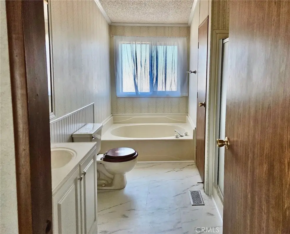 The manufactured home sits on a permanent seismic foundation. Premium dual-glazed Milgard windows, window cladding trim, French doors, and rain gutters reflect premium upgrades. The exterior house and two-car garage are freshly painted. Garage sits on a concrete foundation with a new garage door, full electrical, and side entry door.