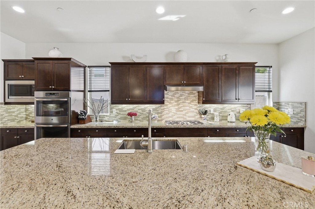 At the heart of the home is a gourmet kitchen featuring premium stainless steel appliances, extensive cabinetry, a spacious walk-in pantry, and a massive center island ideal for cooking, gathering, and entertaining. The kitchen flows effortlessly into the living and dining areas, creating the perfect setting for both everyday living and hosting guests. The home also includes a dedicated laundry space with utility sink, generous counter space, and additional storage.