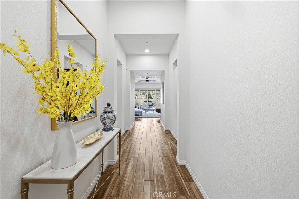 Enter through a welcoming foyer into a light-filled open layout designed for seamless indoor-outdoor living. Lofty vaulted ceilings and gleaming wood-look porcelain floors create an airy feel throughout. Oversized sliding glass doors frame lush surroundings while custom plantation shutters add a refined touch.