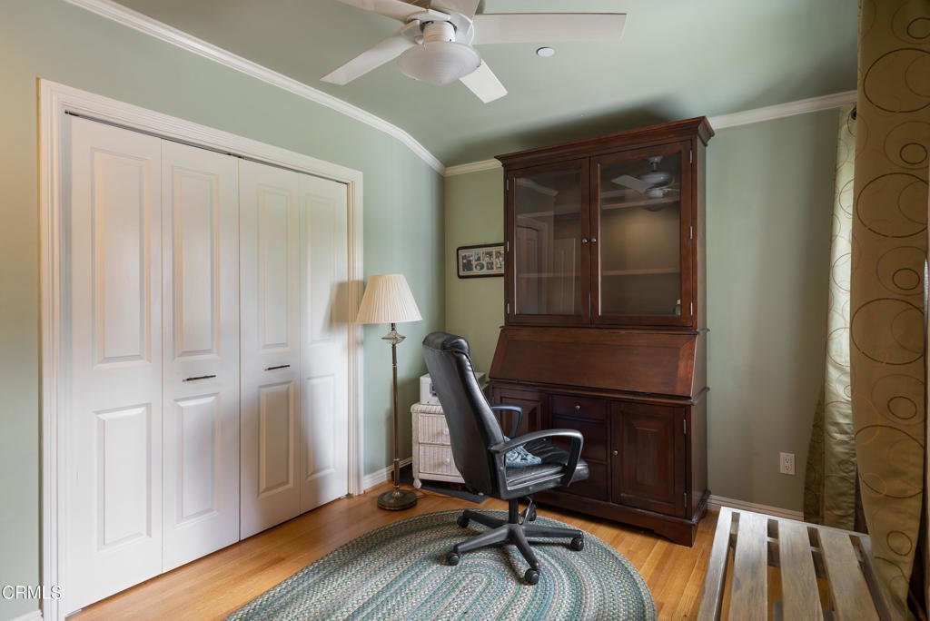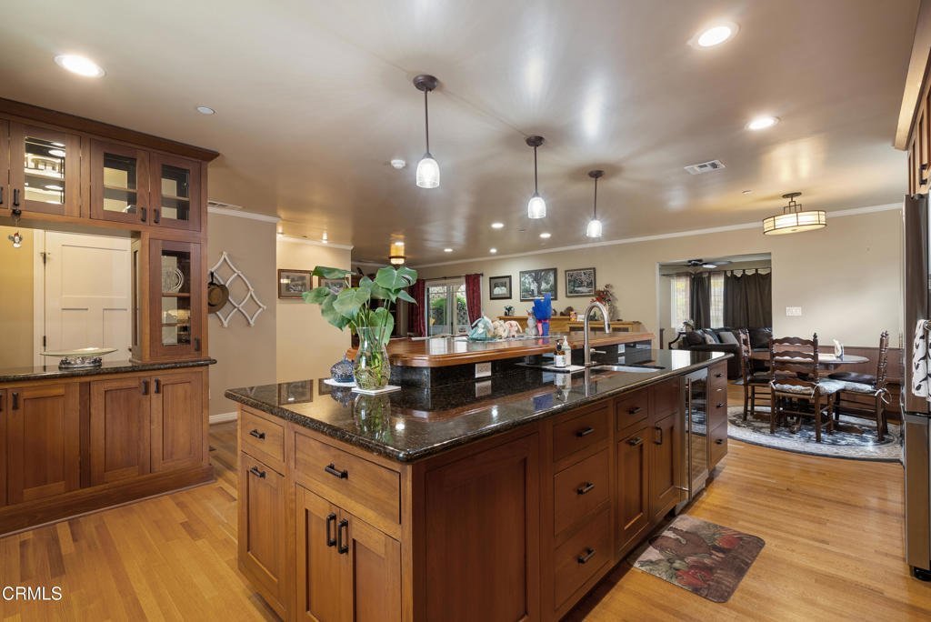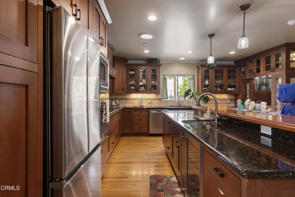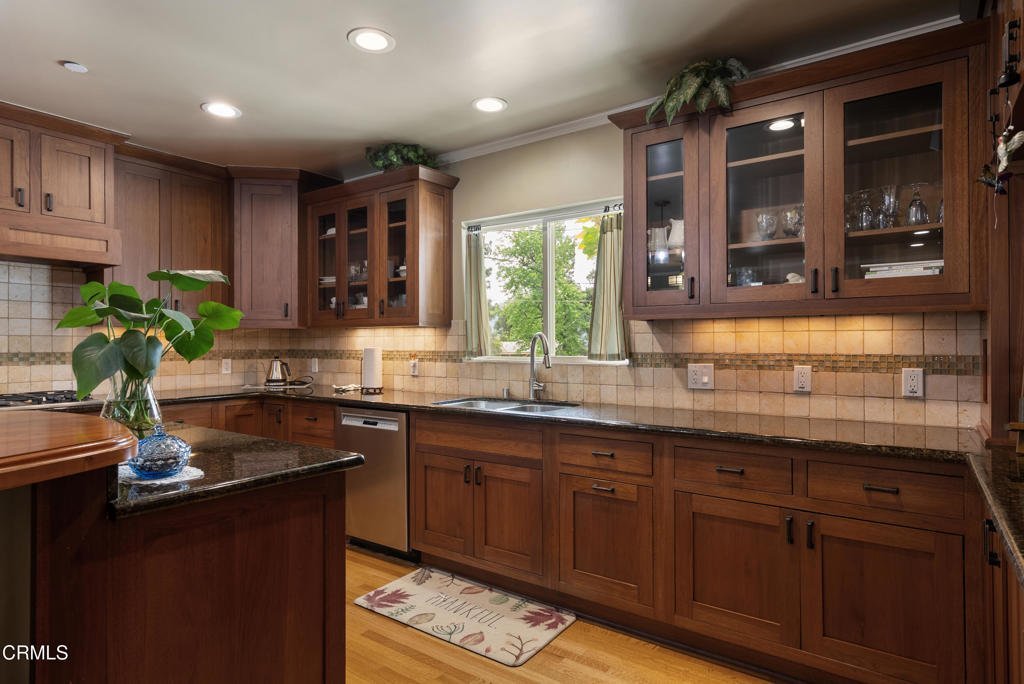 Welcome to 5015 Verwood Avenue where timeless charm meets practical sophistication in one of La Crescenta's most coveted neighborhoods. This exceptional home, on a tree-lined, cul-de-sac street, offers about 2,055 square feet on a 7,529 square foot lot. Step into the spacious living room with built-in cabinets in the entry, hard wood floors and a sliding French door that opens to the beautiful covered, wood deck. The living room features include a cozy fireplace and built-in cabinets on each side. The kitchen is open to the living room and dining area creating a large open great room. The gourmet kitchen boasts custom wood cabinetry, stainless steel appliances including a 28 bottle wine cooler. The island bar seating is great with a utility sink and cabinets. The dining nook has built in bench seating and storage too. Flowing through the kitchen is the family/media room with another sliding French door that opens to the deck. Toward the west of the living room is a hallway that leads to the three bedrooms. In the hallway is a large laundry closet for a side by side washer and dryer and there's built in cabinets and a utility sink. To the right is the primary suite with another sliding French door open to the deck and a good sized bathroom and large walk in closet with built in shelving. To the left of the hallway is a bedroom that has a man door that opens to the attached garage. The guest bathroom offers a dual sink, recessed lights, a hydro system bathtub, skylight and storage. At the end of the hall is the guest bedroom. The home has a fire sprinkler system, two tankless water heaters, central air and heat and a brand new roof installed approximately 2 years ago. The front yard is beautifully landscaped with good quality artificial turf and tasteful plants and flowers. The backyard has a redwood deck and patio cover and is also beautifully landscaped.