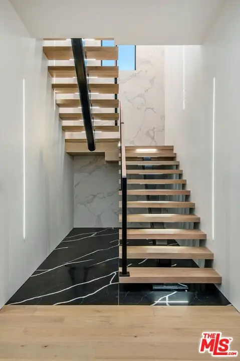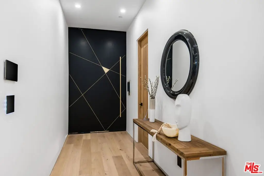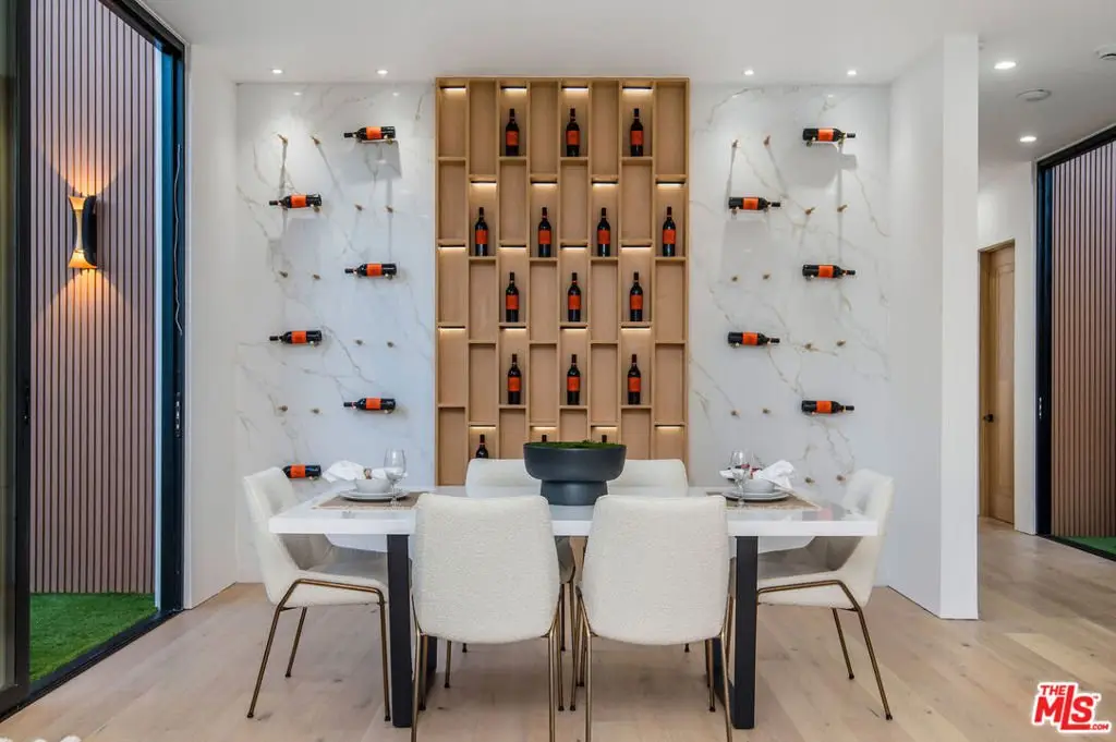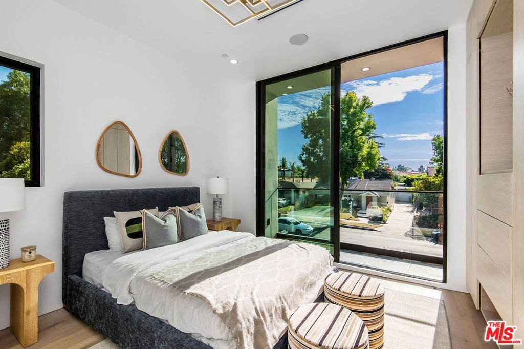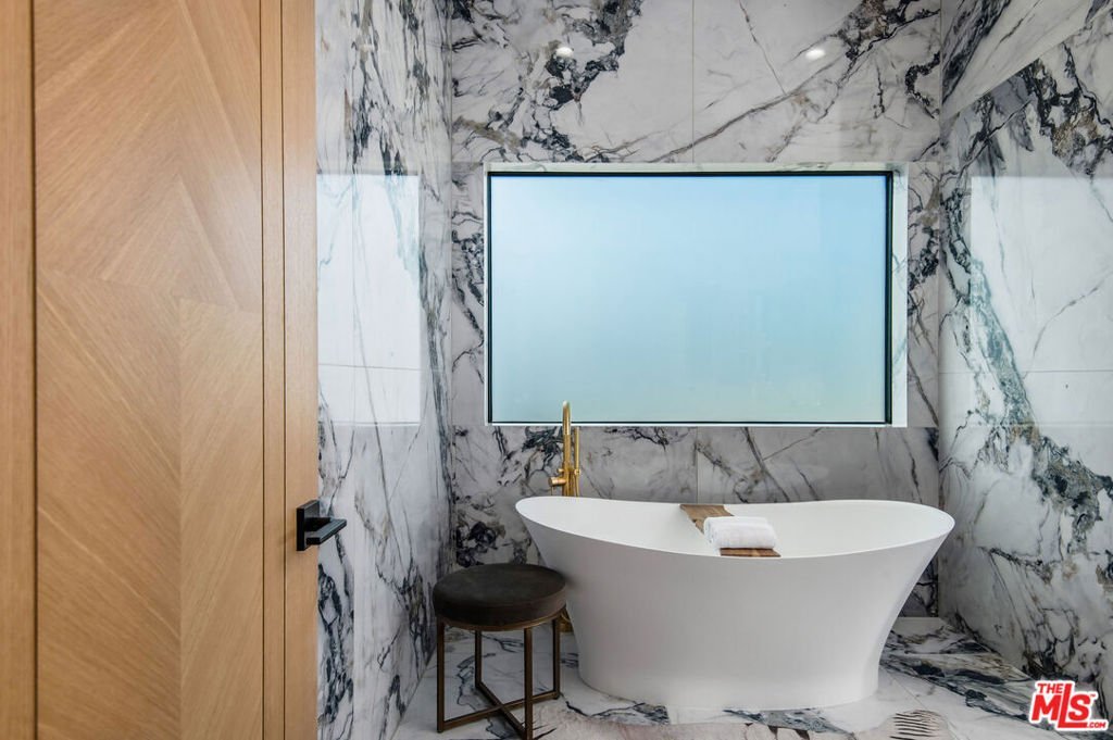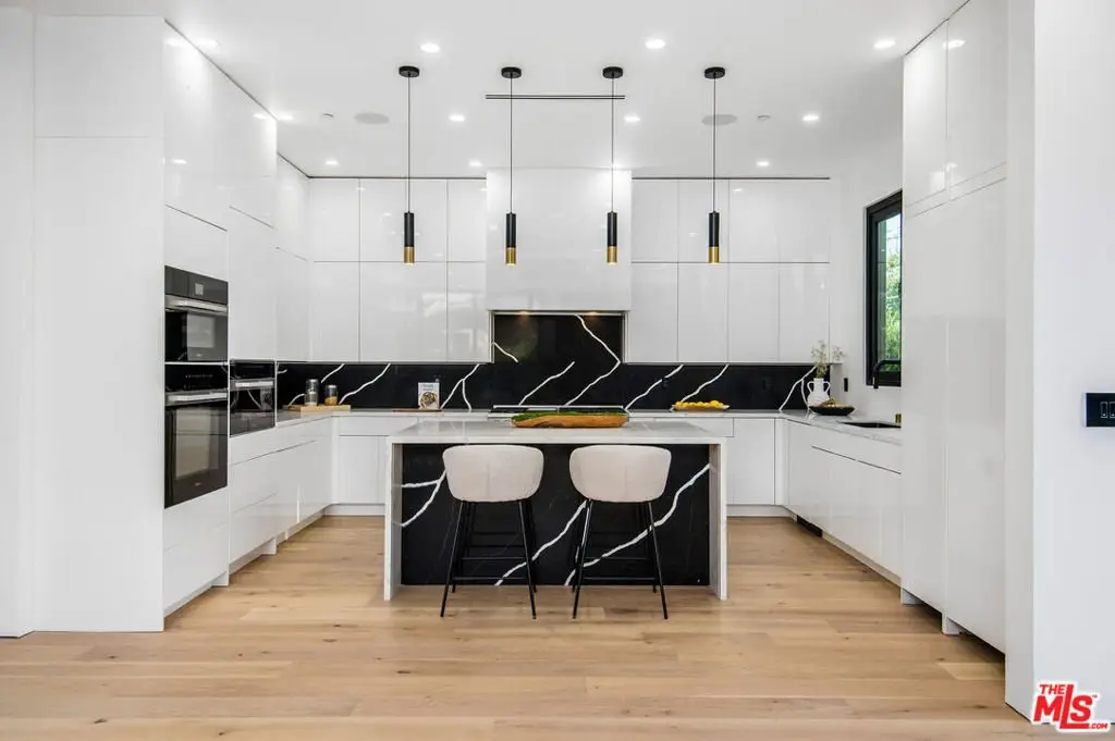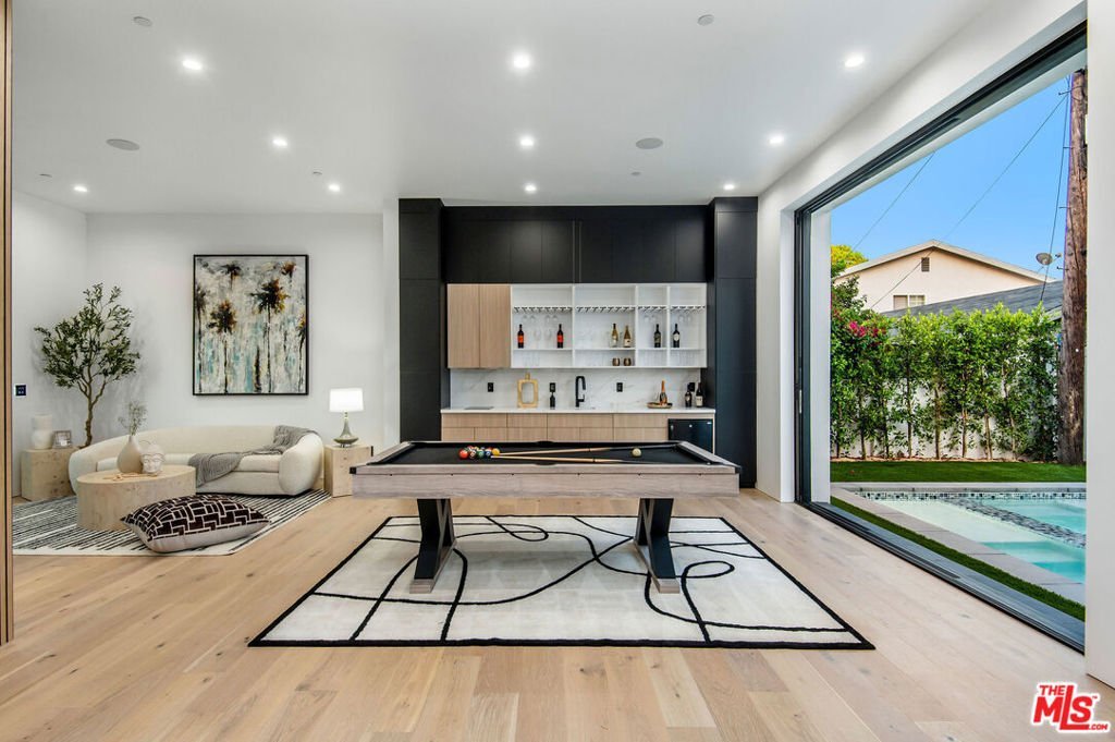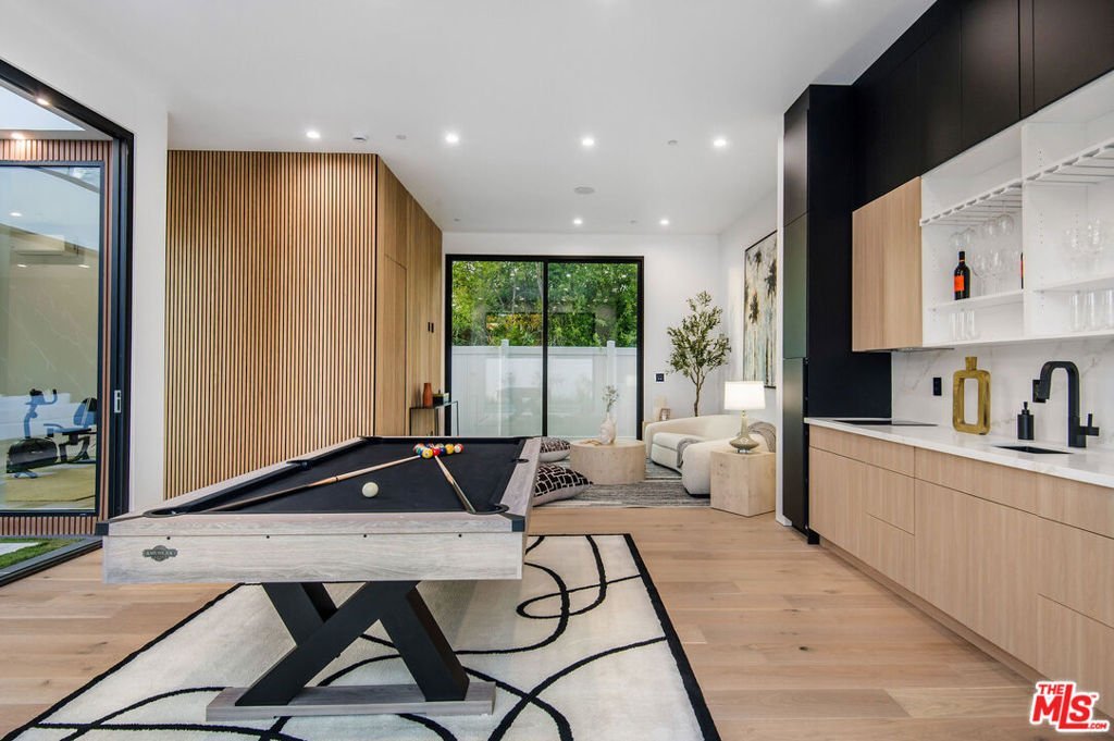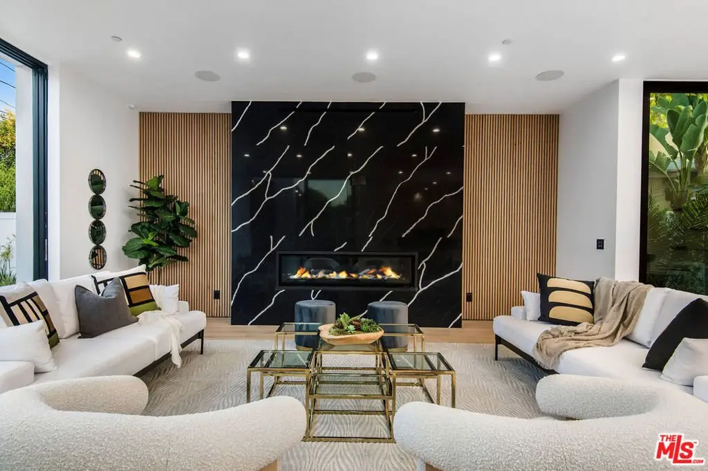 Wonderfully expansive contemporary home uniquely sited south of Ventura Boulevard, close to El Caballero Country Club in an enviable part of Encino. Two stories, with an architectural entry, 5132 Lindley Avenue boasts vast entertainment spaces, many with wood paneled walls and grand moonstone quartz that emulates the impressive exterior entrance. The living room is anchored with a custom-built floor-to-ceiling black and white fireplace, elegant paneling, and banks of modern bespoke doors offering backyard vistas to the pool and family room, a dining area, wine wall, and a beautifully appointed modern chef's kitchen with Miele appliances, 60" dual oven range and a generous marble pull-up waterfall island. This bright 5-bedroom, 6-bathroom home, completed in 2024, features a cohesive neutral color palette with unmatched quality throughout, including meticulous stonework, beaded wood panels, bespoke cabinetry, and large windows, complemented by wide-plank light oak flooring. All bathrooms feature intricate marble work and brass fixtures; the primary suite boasts a glass-fronted gas fireplace, marble shelving, a walk-in closet, and a stand-alone bathtub. A second ground-floor vocational space features a private additional living area. Oversized pocket doors lead to the outdoor heated pool and spa, and are surrounded by manicured gardens. Other amenities include wired speakers, a comprehensive security system, and WiFi extenders throughout the home, Apple iPad tablets to control home systems, and two AC units for optimal climate control.
