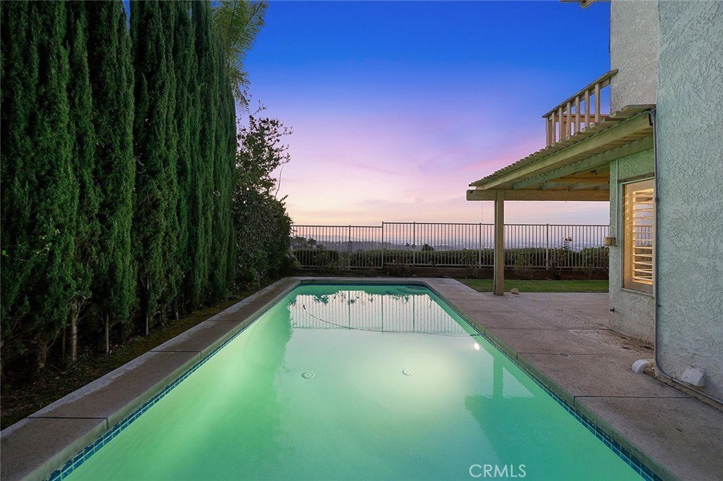 The private backyard features a resistance pool, ideal for exercise or relaxation while enjoying sunset views and surrounding hillsides. Mature landscaping, palm trees, and a wide driveway complement the outdoor setting.