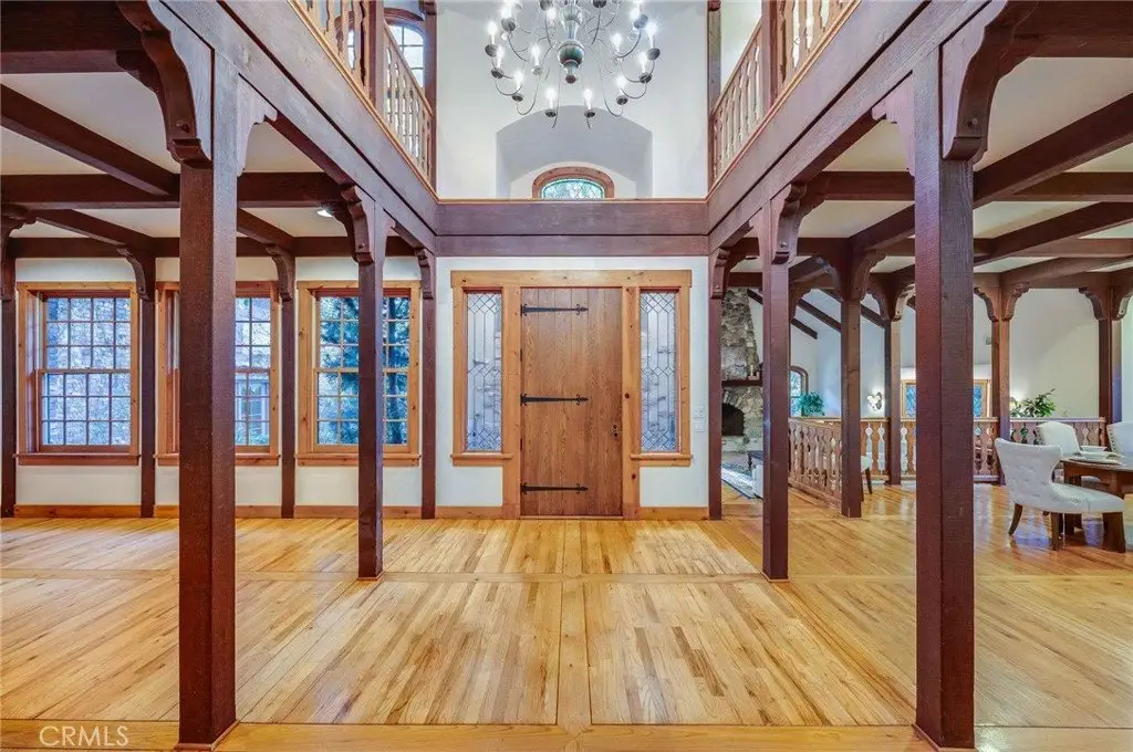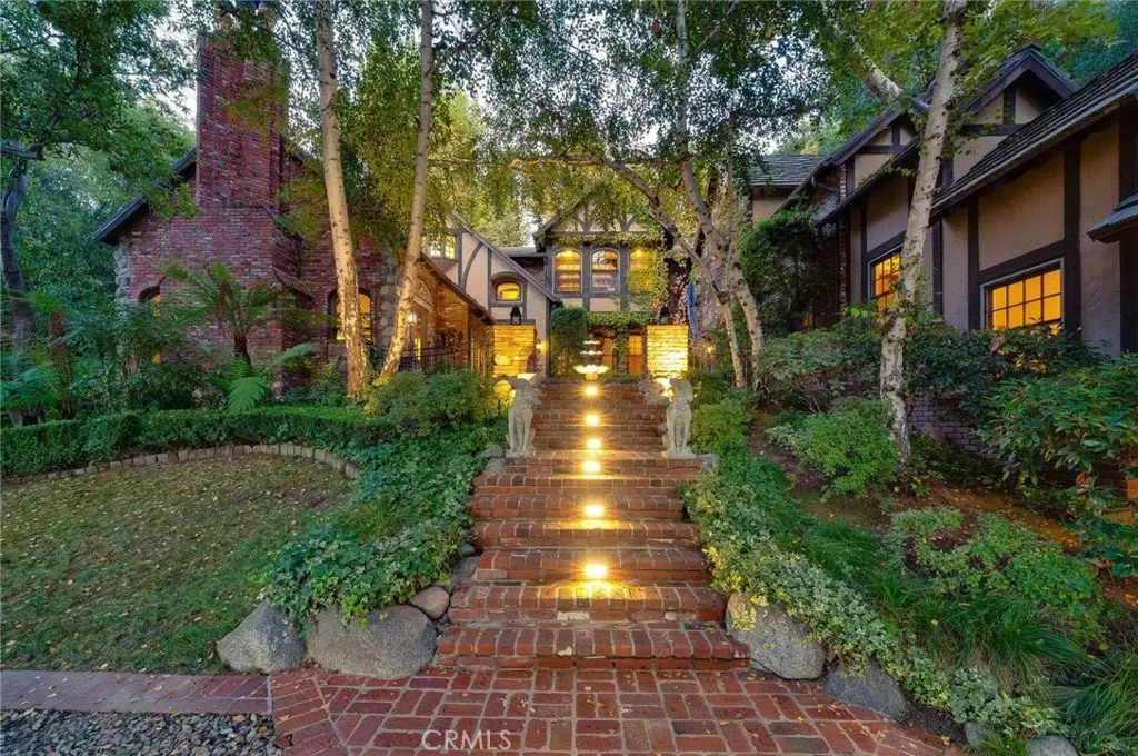Nestled behind private gates on approximately two acres of beautifully manicured, park-like grounds, this stunning English Tudor estate offers 7,516 sq ft of timeless craftsmanship and refined elegance. From its classic timber-beamed and brick exterior, to its intricate interior woodwork, open vaulted ceilings with exposed wood beams, and stained and beveled glass windows, every detail reflects the character and grace of a bygone era—perfectly blended with modern luxury. A grand formal entry welcomes you into a two-story foyer that opens to an expansive floor plan featuring a step-down living room with a dramatic floor-to-ceiling stone fireplace, a large formal dining room, and multiple gathering spaces ideal for entertaining. The gourmet kitchen is complemented by granite countertops with custom cabinets, island with prep sink, a butler’s pantry with wet bar, walk-in pantry, and premium appliances including Sub-Zero, Thermador, and KitchenAid. Unique spaces such as a charming potting room, large craft room, upstairs bonus/play room, separate office/library, and a game room with pool table add character and versatility. There is truly plenty of space for everyone!