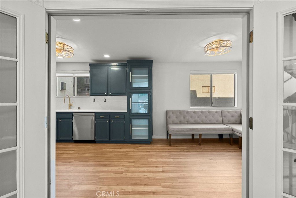 Enter through stately double doors with original vintage hardware into soaring ceilings and a light-filled living room that opens to a charming private patio — perfect for morning coffee or evening cocktails. A few steps up, the home reveals a formal dining room with built-in cabinetry, a stylish guest powder room, and an updated kitchen featuring brand-new stainless-steel appliances, quartz countertops, new backsplash, and a cozy breakfast nook, ideal for both entertaining and everyday living.