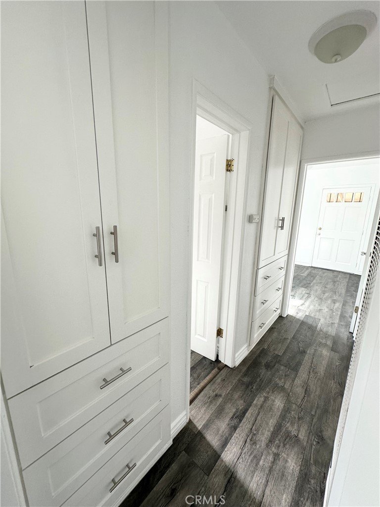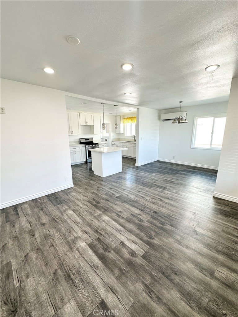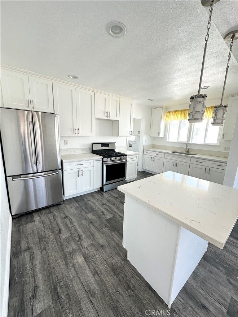 Step inside to an inviting open concept living area where the kitchen seamlessly flows into the living room, creating a bright and spacious atmosphere. The home features modern white cabinetry throughout, laminate wood flooring, and a clean, contemporary aesthetic. The kitchen is equipped with stainless steel appliances, including the refrigerator and stove.