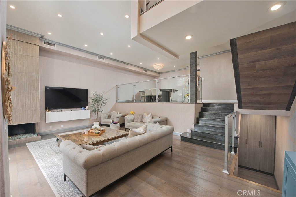 Sophisticated living awaits in this stunning residence ideally situated in a quiet interior location within the highly coveted Encino Spa community. Showcasing soaring ceilings, gleaming wood floors, and beautifully curated designer finishes, this exceptional home offers a refined blend of comfort and contemporary style. A dramatic double-door entry opens to expansive living spaces filled with natural light. The elegant living room is anchored by a striking fireplace and framed by floor-to-ceiling windows that seamlessly connect to the private entertainer’s patio—creating the perfect setting for indoor-outdoor living. At the heart of the home is the beautifully designed chef’s kitchen, featuring sleek custom cabinetry, quartz countertops, stainless steel appliances, glass tile backsplash, and a sunlit casual dining area ideal for everyday living. The residence offers three generously sized bedrooms, highlighted by the impressive primary suite with soaring ceilings, sitting lounge, private balcony, and an expansive dressing area with both walk-in and wardrobe closets. The spa-inspired primary bath features dual vanities, a jetted soaking tub, and an oversized seamless glass shower.