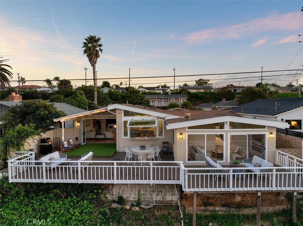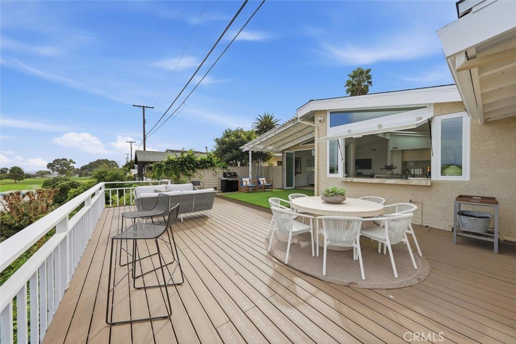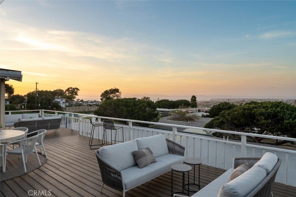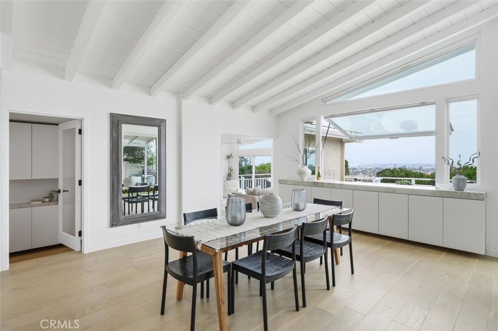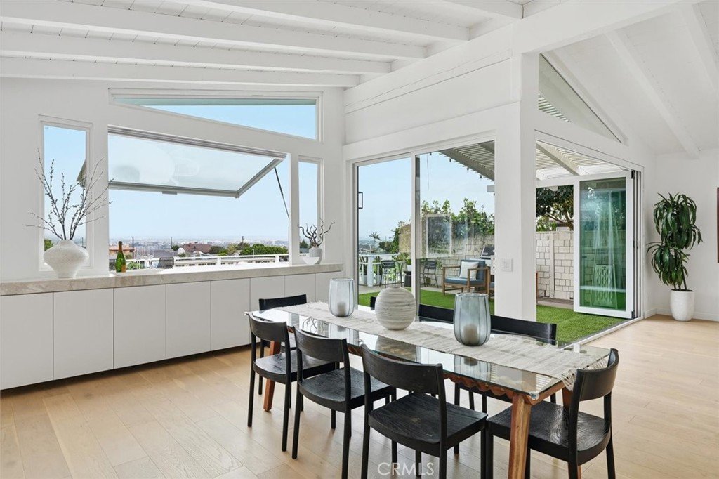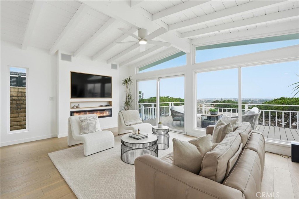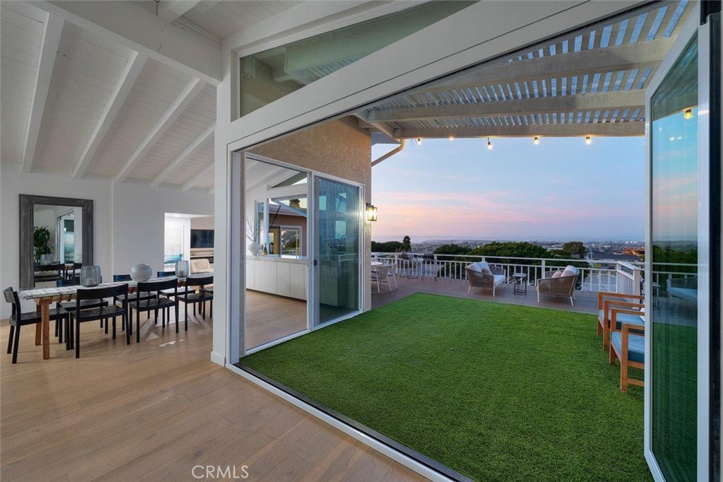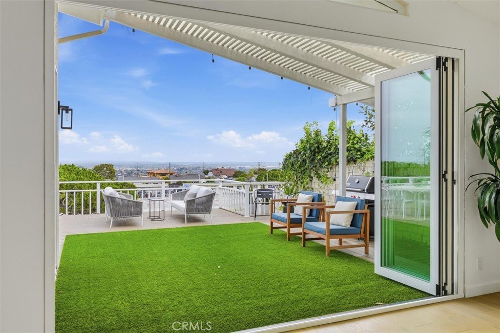 Set on a single level in the Riviera, this home has been beautifully remodeled with a refined, modern aesthetic and sweeping mountain, city and ocean views. Enter through steel 8-foot Pinky’s double doors into a welcoming foyer with a live ficus and engineered hardwood floors that run throughout the home. The dramatic main living area has vaulted ceilings and an effortless indoor-outdoor connection. An accordion glass door opens wide to a 1,100-square-foot composite deck, designed with multiple seating areas to take in the incredible views. Lighted stairs and smart-home exterior lighting elevate the outdoor experience, while dual-zone wired speakers extend seamlessly from the interior to the deck for easy entertaining. At the center of it all is a stunning kitchen anchored by a massive island topped in premium Taj Mahal quartzite, seating for barstools, prep sink and a beverage refrigerator. Other nice details such as soft accent lighting, Bosch appliances and a Bertazzoni range with brass burners create a kitchen that is equal parts sleek and functional. Adjacent to the kitchen, the formal dining area is positioned beside an oversized custom window that opens directly to the outdoor bar, creating a seamless pass-through for entertaining. A butler’s pantry adds convenience with its own sink and built-in wine and beverage refrigerator. Taj Mahal quartzite continues throughout the indoor-outdoor bar, butler’s pantry and primary bath, tying the spaces together with a cohesive and luxurious finish. Two secondary bedrooms share a bath with a floating vanity, tiled walls, custom maple cabinetry, skylight and a wet-room setup with soaking tub. An additional bathroom features a spacious shower with a rainfall shower head. The formal living area captures the views through oversized windows and opens directly to the back deck through sliding doors. Custom built-ins include a television niche, accessory nook and an electric fireplace with heater. The primary suite is a calming retreat with a walk-in closet and a sliding door leading to a private side yard. The spa-like bath features dual sinks, maple cabinetry, large-scale tile and a lighted mirror. Completing the home is a finished garage with epoxy floors, offering ideal flex space for a workout studio, office or playroom with direct access to the home. Additional upgrades include a 2025 gas tankless water heater, ceiling fans in all bedrooms and living area.