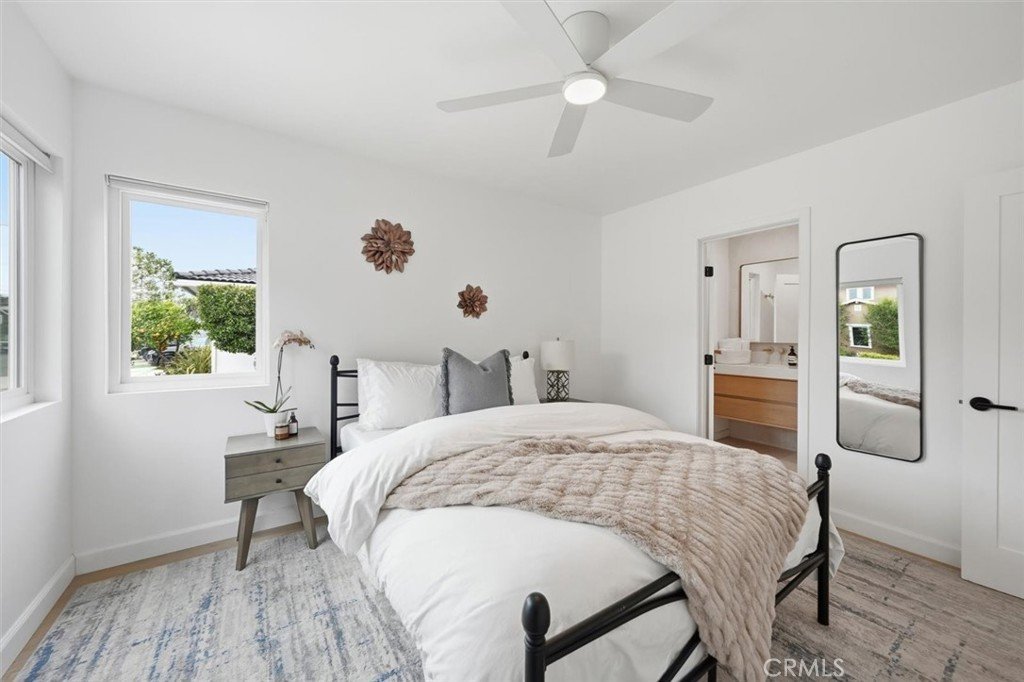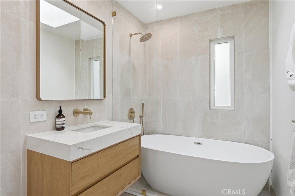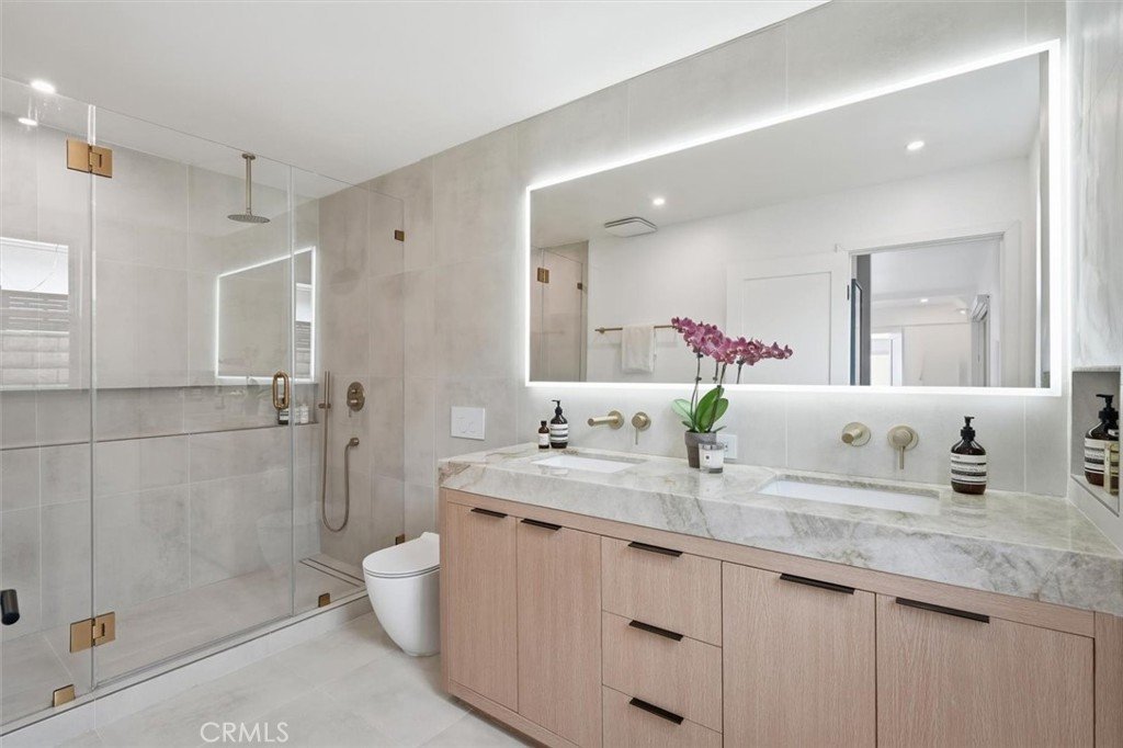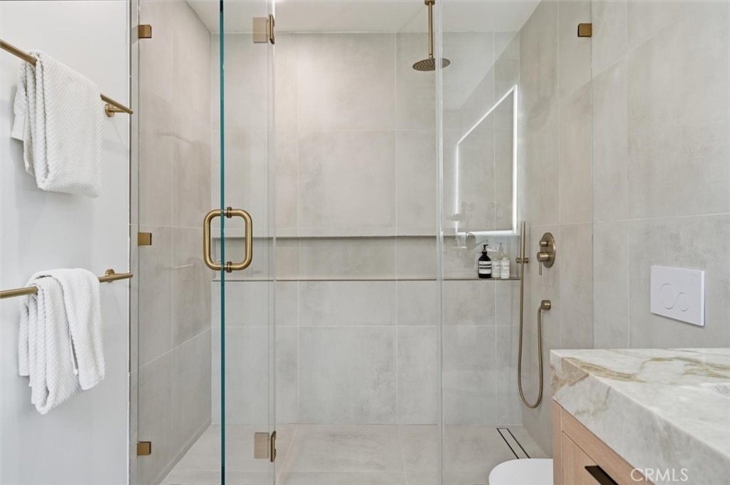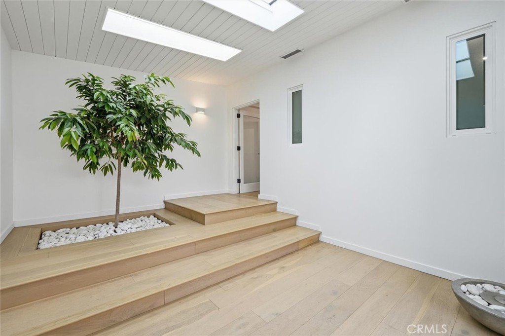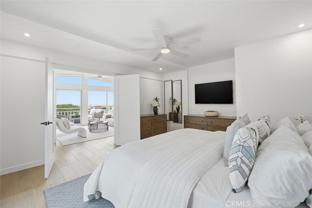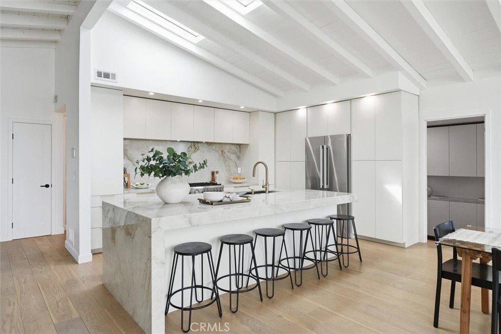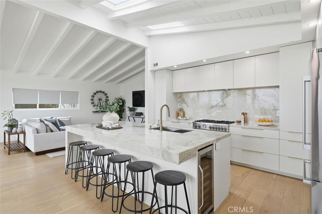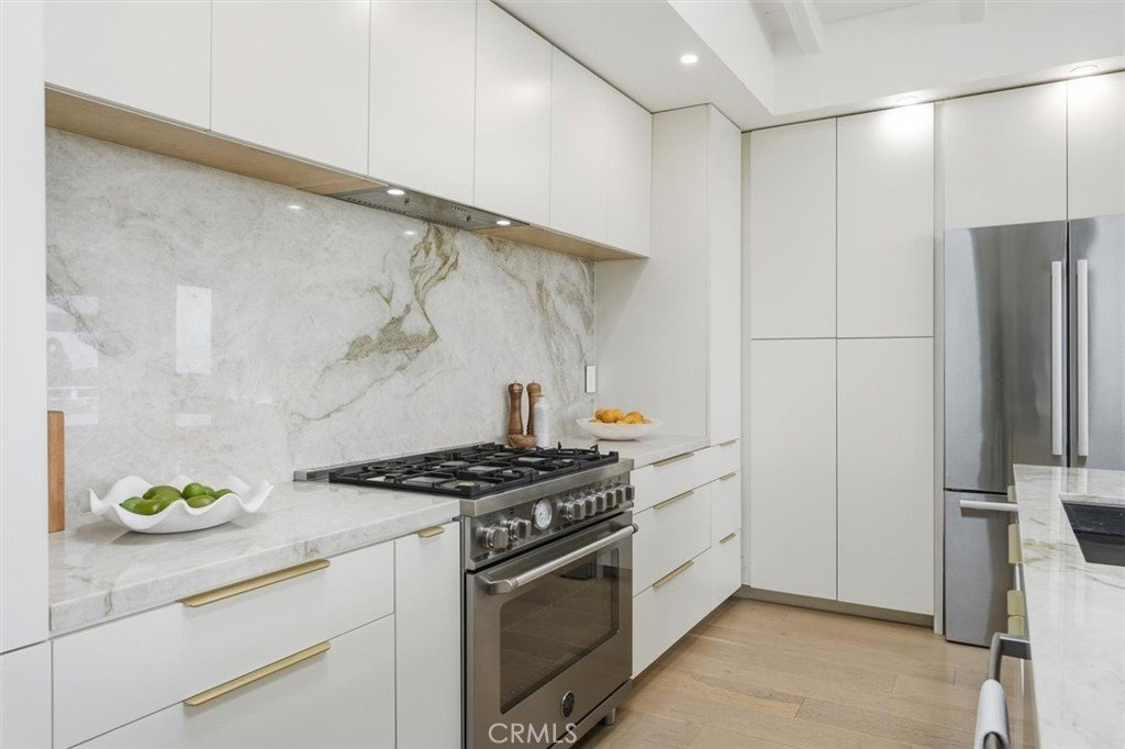 Set on a single level in the Riviera, this home has been beautifully remodeled with a refined, modern aesthetic and sweeping mountain, city and ocean views. Enter through steel 8-foot Pinky’s double doors into a welcoming foyer with a live ficus and engineered hardwood floors that run throughout the home. The dramatic main living area has vaulted ceilings and an effortless indoor-outdoor connection. An accordion glass door opens wide to a 1,100-square-foot composite deck, designed with multiple seating areas to take in the incredible views. Lighted stairs and smart-home exterior lighting elevate the outdoor experience, while dual-zone wired speakers extend seamlessly from the interior to the deck for easy entertaining. At the center of it all is a stunning kitchen anchored by a massive island topped in premium Taj Mahal quartzite, seating for barstools, prep sink and a beverage refrigerator. Other nice details such as soft accent lighting, Bosch appliances and a Bertazzoni range with brass burners create a kitchen that is equal parts sleek and functional. Adjacent to the kitchen, the formal dining area is positioned beside an oversized custom window that opens directly to the outdoor bar, creating a seamless pass-through for entertaining. A butler’s pantry adds convenience with its own sink and built-in wine and beverage refrigerator. Taj Mahal quartzite continues throughout the indoor-outdoor bar, butler’s pantry and primary bath, tying the spaces together with a cohesive and luxurious finish. Two secondary bedrooms share a bath with a floating vanity, tiled walls, custom maple cabinetry, skylight and a wet-room setup with soaking tub. An additional bathroom features a spacious shower with a rainfall shower head. The formal living area captures the views through oversized windows and opens directly to the back deck through sliding doors. Custom built-ins include a television niche, accessory nook and an electric fireplace with heater. The primary suite is a calming retreat with a walk-in closet and a sliding door leading to a private side yard. The spa-like bath features dual sinks, maple cabinetry, large-scale tile and a lighted mirror. Completing the home is a finished garage with epoxy floors, offering ideal flex space for a workout studio, office or playroom with direct access to the home. Additional upgrades include a 2025 gas tankless water heater, ceiling fans in all bedrooms and living area.