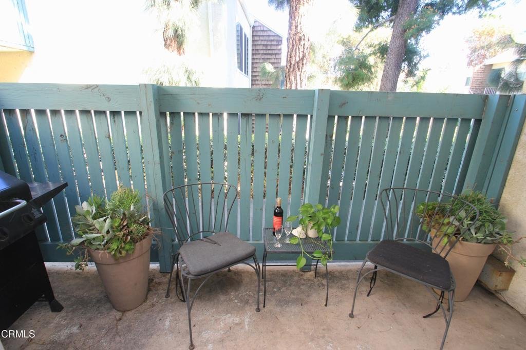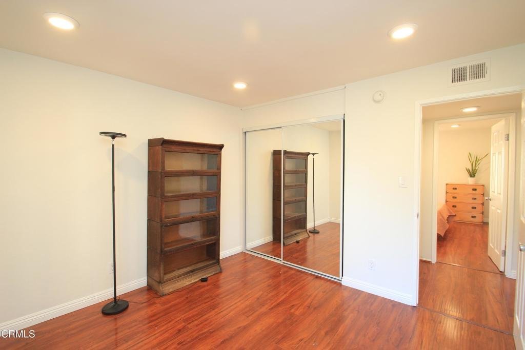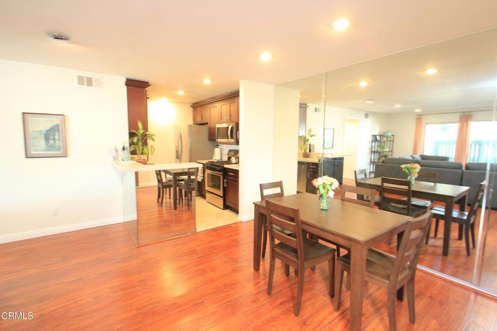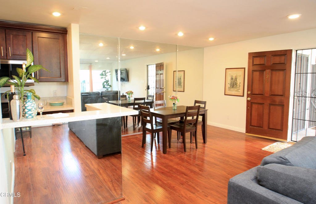 Welcome to this elegant and sophisticated single-story, ground-floor condominium featuring a thoughtfully designed floor plan and stylish updates throughout. Freshly painted interiors and beautiful wood-like flooring create a bright, inviting atmosphere from the moment you enter.The spacious living room offers plenty of room for relaxing or entertaining and opens to a cozy, private patio--perfect for enjoying morning coffee or evening breezes. The dining area is enhanced by dramatic floor-to-ceiling mirrors that reflect natural light and create an open, airy feel.The kitchen features quartz countertops, lovely cabinetry, and ample workspace for everyday cooking or hosting guests. Both the primary and secondary bathrooms have been fully updated with custom tile and stone finishes, adding a touch of luxury to the home.Bedrooms are generously sized and include mirrored closet doors and excellent storage space. A convenient hall linen closet adds additional organization.Located in a centrally situated gated community with a peaceful, park-like setting surrounded by mature, tall trees. Residents enjoy amenities including a swimming pool and convenient on-site laundry facilities. Unit features two assigned parking spaces one of which is covered.A wonderful opportunity to own a beautifully maintained home in a serene and well-located complex.
