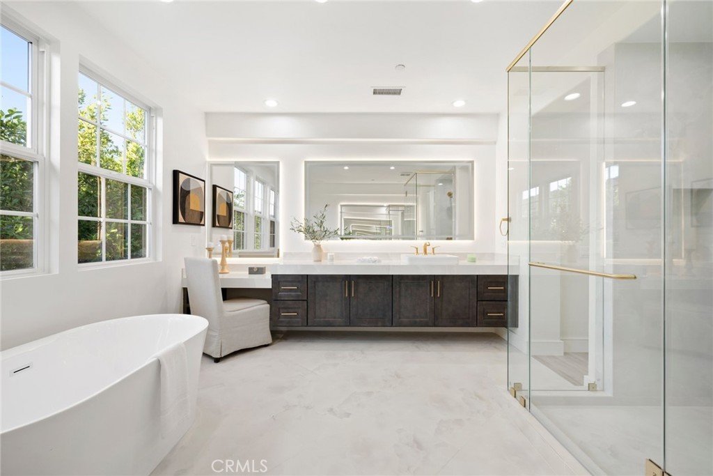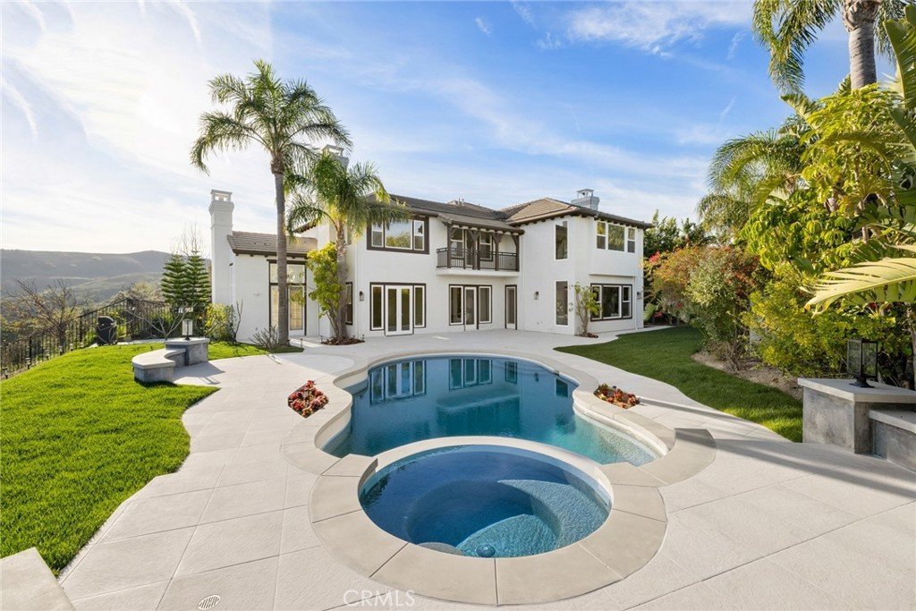 Welcome to this stunningly reimagined estate, set behind the gates of the Mont Calabasas enclave. Nestled at the end of a quiet cul-de-sac this fully remodeled 5-bedroom, 5.5-bath residence offers sweeping mountain vistas and breathtaking panoramic views from nearly every room. Set on over an acre with lush landscaping, a private drive, and expansive grounds, this property is truly one of a kind. A grand foyer with soaring ceilings introduces the home’s elegant interiors, featuring new hardwood flooring and premium fixtures and finishes throughout. The chef’s kitchen is a true showpiece, offering dual islands, a spacious pantry, breakfast area and bar, built-in dry bar with wine refrigerator, and new stainless steel Thermador and Bosch appliances—ideal for both everyday living and entertaining. The kitchen flows seamlessly into the spacious family room, highlighted by an oversized picture window framing serene backyard views. The main level also includes a private guest or maid’s suite with separate entrance, patio, en-suite bath, generous closet, and stunning views—perfect for guests, extended family, or a home office. Additional first-floor amenities include a spacious laundry room and a stylish upgraded powder room. Formal living and dining rooms open directly to the backyard, creating effortless indoor-outdoor living. A separate den or office provides an inviting retreat with its own fireplace, backyard access, and tranquil garden views. Upstairs, a versatile secondary family room or study offers flexible living space. All secondary bedrooms feature beautifully updated en-suite baths and custom closet built-ins, with one enjoying a private balcony. The luxurious primary suite is a true sanctuary, complete with a private sitting or yoga room, spa-inspired bath with a freestanding tub and separate shower. The resort-style backyard is designed for entertaining and relaxation, featuring two patios, a sparkling pool and spa, BBQ, citrus trees, and lush rose gardens. Solar panels service the pool for enhanced energy efficiency. Additional highlights include dual two-car garages providing four covered parking spaces, plus ample driveway parking. Ideally located near Malibu beaches, award-winning Las Virgenes schools, premier shopping and dining, and convenient freeway access. This exceptional, turn-key estate offers rare privacy, luxury, and breathtaking views in one of Calabasas’ most coveted gated communities.