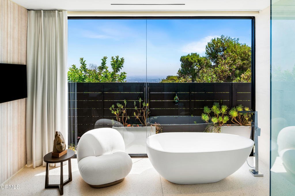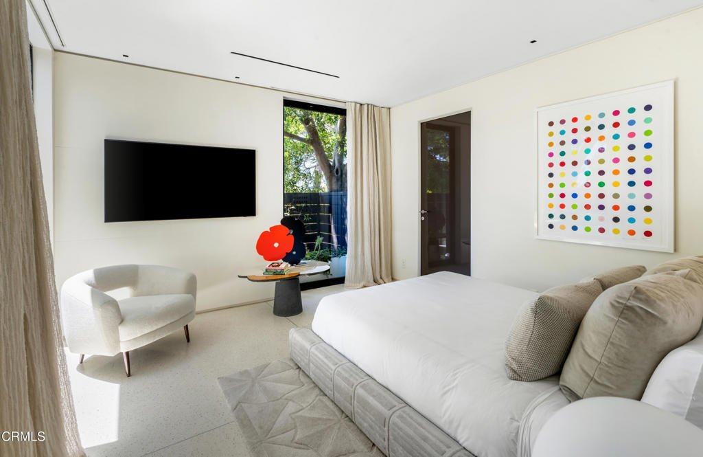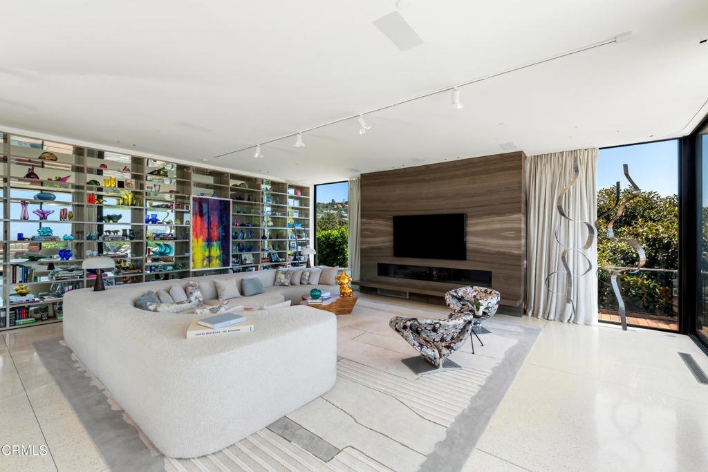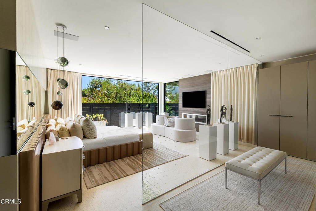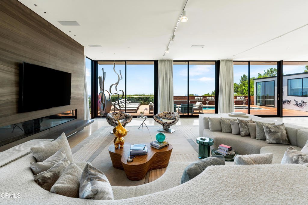 Situated on one of the most esteemed streets in Trousdale Estates, this exceptional contemporary home overlooks the Pacific Ocean, Catalina Island, and Los Angeles' dazzling city lights. Designed by Steve Hermann, the residence features soaring 12-foot ceilings, walls of glass, and a rare layout with five en-suite bedrooms. It is built with meticulous attention to detail and the highest-quality finishes throughout.The sleek kitchen boasts glossy Poliform cabinetry and top-of-the-line Miele appliances. Beneath a statement suspension lamp by Barovier & Toso, the formal dining room is surrounded by glass sliding doors that open to the front courtyard. The breakfast area and outdoor dining spaces provide additional seating for entertaining, all while capturing stunning backyard views.The primary retreat is worthy of its own private wing, complete with a stone fireplace, a glass-enclosed dressing area, and an opulent en-suite bathroom featuring dual sinks, an Antonio Lupi bathtub, and a generous rainfall shower. Four additional en-suite bedrooms each showcase unique wallpaper, lighting fixtures, and decor. A Control4 smart home system, surround sound system, security cameras, and automatic window treatments are among the many state-of-the-art features.A truly magnificent home that seamlessly combines location, views, privacy, modern design, and warm textures.