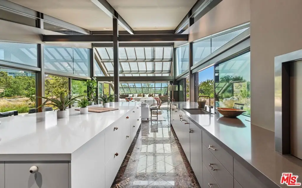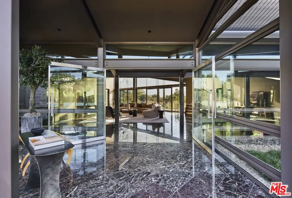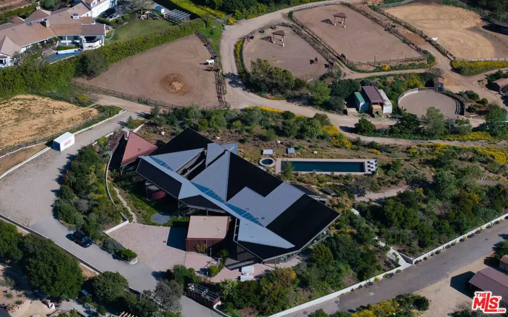 Set on a plateau above Bonsall Canyon in Malibu, this extraordinary property offers an abundance of natural light and captures stunning mountain and ocean views. Spanning four level acres, the estate epitomizes the art of modern architecture and design. Conceived by visionary architect Ed Niles, FAIA, this iconic residence is a striking example of architectural innovation. Surrounded by breathtaking vistas of mountains, canyons, and the shimmering Pacific Ocean, the property offers complete seclusion, accessible via dual gated entries for a truly private retreat. Unlike conventional coastal designs, this 7,200-square-foot masterpiece seamlessly blends concrete, steel, and expansive glass walls in a unique structure crowned by a dramatic wing-shaped butterfly roof. This bold architectural statement not only makes a striking visual impression but also integrates the residence harmoniously with its lush surroundings. Additionally, 1,500 square feet of cantilevered stone terraces enhance the indoor-outdoor flow, providing captivating viewpoints from every angle. The home's sophisticated interiors are a celebration of refined tranquility. Italian marble floors, custom hand-painted pillars, and a subtle coastal palette complement the abundant natural light, creating an atmosphere that is both serene and inviting. Six distinct wings extend from a central hall, each offering a unique character and relationship to the surrounding landscape. From the soaring living room and peaceful study in one wing to the open great room with a gourmet kitchen, dining area, and family room, the layout encourages both intimate gatherings and grand entertaining. Floor-to-ceiling glass walls throughout the home provide sweeping views of the infinity pool, surrounding gardens, and the rugged Malibu landscape, ensuring that every space is bathed in natural light. The primary suite, located in a private wing, features an opulent spa-inspired bathroom with a glass-enclosed shower, an Italian marble soaking tub, and spacious custom closets. Four additional bedrooms, each with remarkable views, offer luxurious accommodations for guests or family members. Designed for sophisticated outdoor living, the estate features a shimmering swimming pool, spa, and a fully equipped outdoor kitchen and BBQ area. A shaded dining pavilion offers the perfect setting for alfresco dining, while professional equestrian facilities complete with a 4-stall barn, a professional jumping arena, and ample pastures provide an unparalleled equestrian lifestyle. The property offers direct access to over 400 miles of scenic riding, hiking, and biking trails, or simply a short golf cart ride to Malibu's pristine beaches.With approved plans for two additional guest structures, this estate is a rare offering, embodying Malibu's spirit of architectural ingenuity, elegance, and natural beauty. This is more than just a home; it's a serene sanctuary and a landmark of modernist design in one of Southern California's most desirable settings.