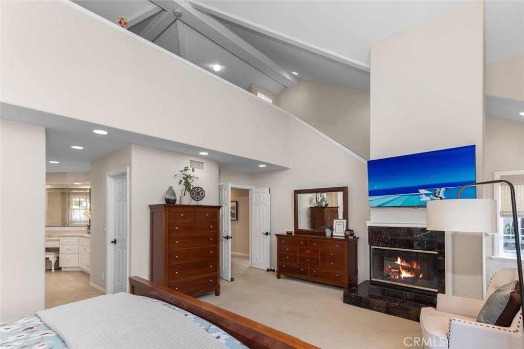 primary retreat with soaring ceilings, a cozy fireplace, French doors, and dramatic floor-
