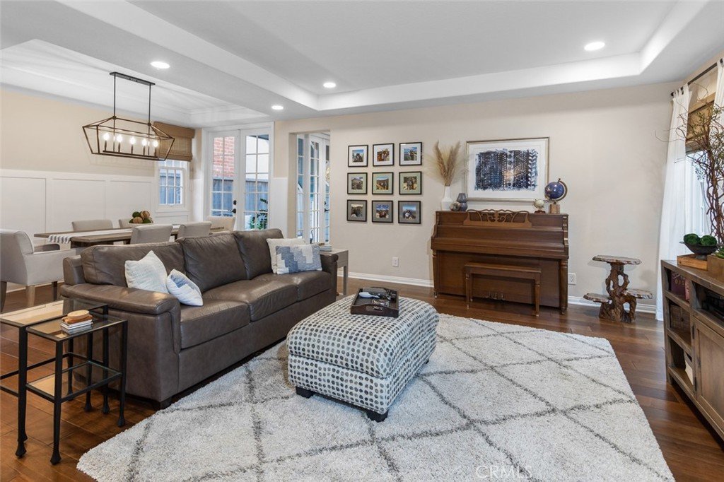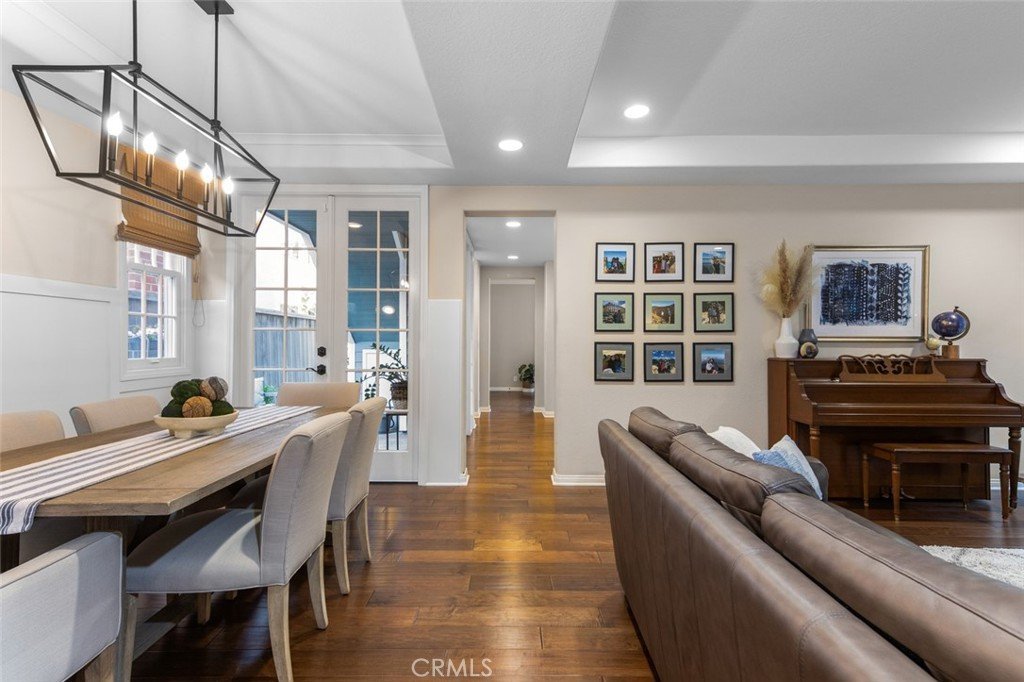 welcome you into a formal living room with an elegant fireplace and rich wood floors.