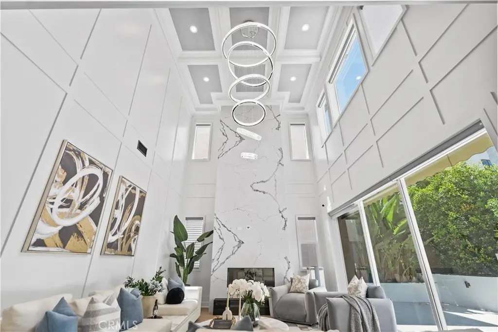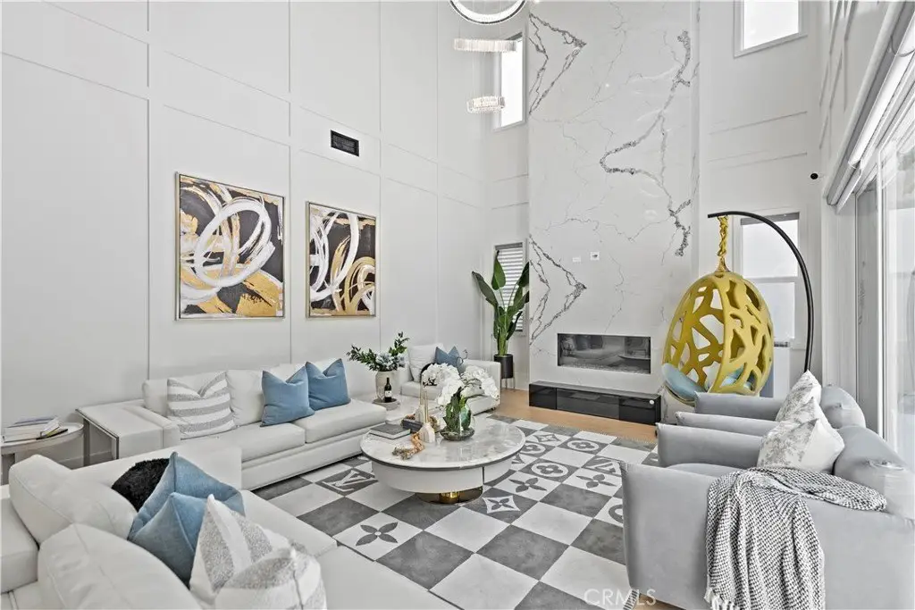 Enter through a dramatic three-story foyer highlighted by soaring ceilings and an elegant chandelier. To the right, a spacious room currently serves as a home office but can easily convert into a bedroom or private gym.The impressive two-story great room boasts custom wall paneling and a striking linear fireplace set against a floor-to-ceiling natural stone backdrop, creating a warm yet sophisticated atmosphere. Expansive sliding doors open to a beautifully landscaped backyard featuring a built-in children’s swing bed and tranquil water feature—perfect for entertaining or unwinding under the stars.The modern chef’s kitchen is a dream, offering a large center island with breakfast bar, abundant cabinetry and counter space, and a spacious walk-in pantry. A whole-house water filtration system further enhances comfort and peace of mind.