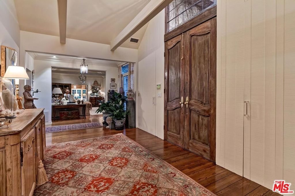 Enter the gated slate motorcourt before stepping into this enchanting secluded wonderland in the heart of the Flats and be prepared to escape from the city. For the first time in 61 years, a fortunate buyer will be able to experience this spacious gated/hedged 1sty European Villa as their new 5-star resort-style home. This designer-curated masterpiece expertly achieves a dramatic level of timeless taste. Super high vaulted ceilings, skylights, beams, exquisite wood flooring, built-ins, custom paneling, and French doors are featured in multiple spaces. Grand entry foyer flows easily to the public rooms for maximum entertaining capacity. The living room with vaulted beamed ceilings leads to a gracious den/library which opens to charming brick patios surrounding an inviting fountained pool. Two other substantial entertaining yards exist with one private in the front and one central slate courtyard accessed by the dining area and primary suite. Sizable skylit cook's kitchen with top stainless appliances and pantry areas. The enormous primary suite featuring dramatic high vaulted beamed ceilings contains a large sitting area, fireplace, dual baths, dual walk-ins, and direct access to the inner slate courtyard. An adjacent den/office can readily be utilized as a convertible 4th bedroom. One other guest bedroom suite exhibits the size of another primary suite and also includes a sitting area. With over 130 feet of gated frontage featuring mature hedging along with being prominently located on a fantastic corner lot on one of the most prestigious tree-lined roads in the Flats of Beverly Hills, this gem is moments from the best of Beverly Hills and the Westside. Trust Sale.