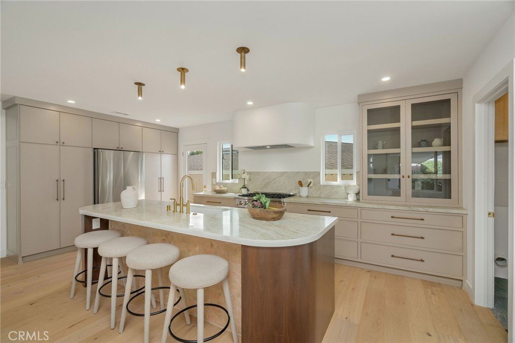 6150 Wooster Avenue is a beautifully remodeled single-level midcentury home in desirable Ladera Heights, blending timeless architectural design with modern upgrades. Light-filled interiors showcase dramatic curved ceilings, a curved floor-to-ceiling glass dining alcove, a sculptural dual stone fireplace serving both living and family rooms, and a stylish wet bar that enhances the home’s entertaining appeal. The remodeled kitchen features premium appliances, refined finishes, and a spacious center island that opens seamlessly to the main living areas. The primary suite offers a walk-in closet and spa-inspired bath with dual vanities, soaking tub, glass-enclosed shower, and custom tilework. Additional bedrooms offer flexibility for guests, a home office, or growing households. Expansive bi-fold doors open to a private backyard with pool and modern landscaping, creating seamless indoor–outdoor flow. An attached three-car garage offers direct access and ample parking.