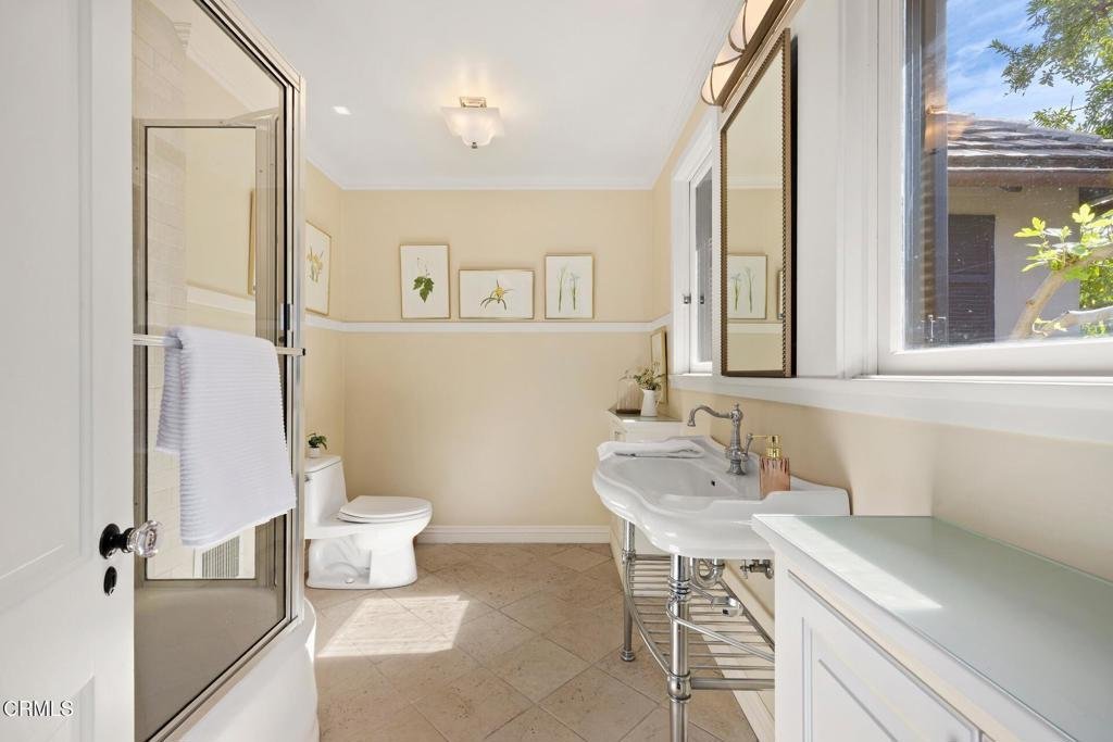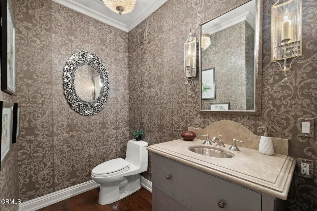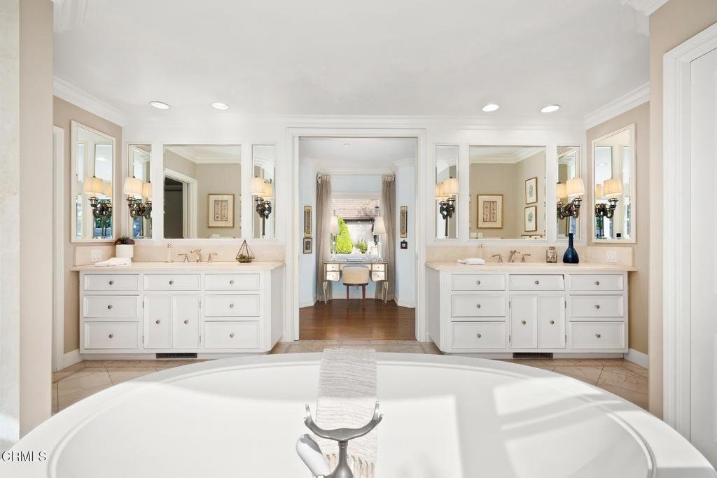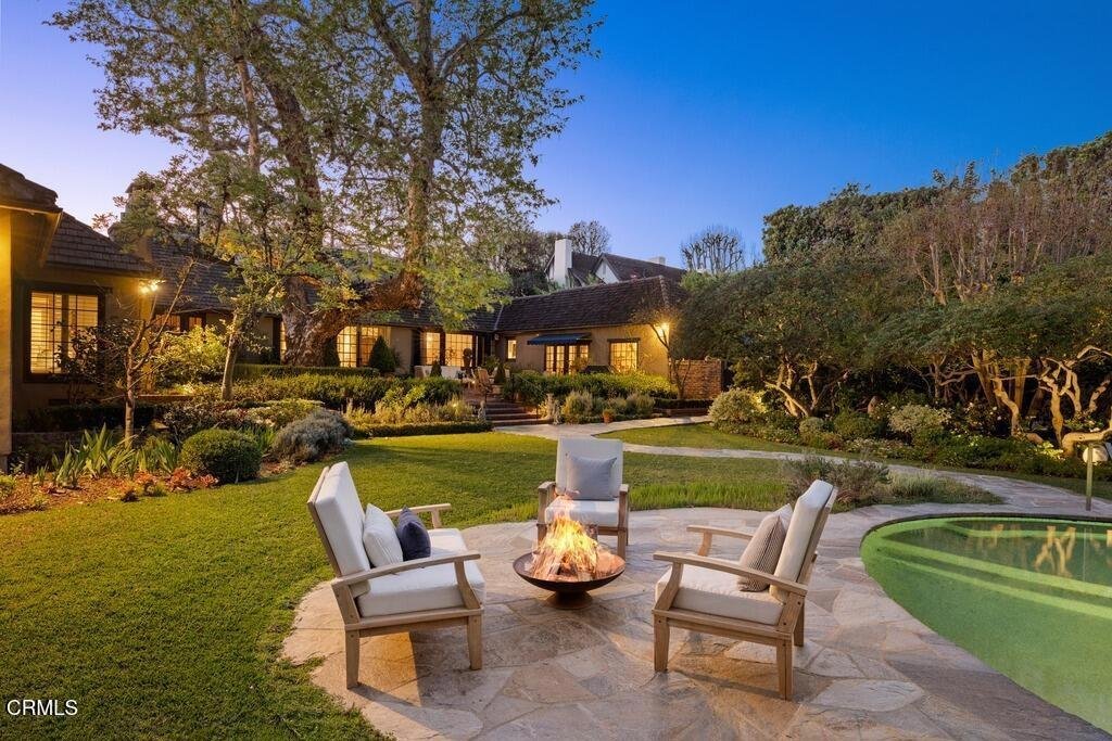 A distinguished four-bedroom, five bath, single story French Normandy residence, thoughtfully renovated and meticulously maintained, set on more than 29,000 square feet of parklike grounds in Pasadena's coveted Caltech Huntington Library district. Designed for easy living, the light filled floor plan offers seamless indoor-outdoor flow, ideal for daily living as well as gracious entertaining.The grand living room opens through sliding French doors to a large brick patio and an extraordinary, award-winning garden beyond. Anchored at the eastern edge of the property by a magnificent redwood, the grounds unfold across a sparkling pool and expansive lawn, creating a serene and private outdoor setting that embodies the best of the California lifestyle.The chef's kitchen features stone countertops, custom furniture grade illuminated cabinetry, and professional stainless-steel appliances by Sub Zero, Miele, Wolf, and Bosch. A cozy family room, with beamed ceiling, built in bar, and wood burning fireplace, opens to both the kitchen and the outdoor brick patio. A well-appointed butler's pantry, with Sub Zero beverage refrigerator, freezer, and abundant built ins, sits just beyond the kitchen and adjacent to a versatile fourth bedroom, office, or gym with a three-quarter bath and laundry.A handsome library with its own fireplace provides a quiet retreat and thoughtfully separates the public living spaces from the homes two private bedroom wings. The primary suite is a true sanctuary, introduced by a vestibule entry and centered around a generous bedroom with lounging area and fireplace. Two luxurious baths feature stone counters, expansive showers, custom cabinetry, and bespoke California Closets; one bath includes a soaking tub with French doors that open to a private secret garden. The secondary wing features two spacious en suite bedrooms, each enjoying abundant natural light and generous walk-in dressing closets.In addition to the front-of-house circular driveway, there is a recently constructed 680-square-foot detached garage with a ceiling height that can accommodate up to six vehicles. An attached 163-square-foot storage, playroom, or bonus space complements the building. Gated and fenced, the property offers exceptional comfort and privacy.