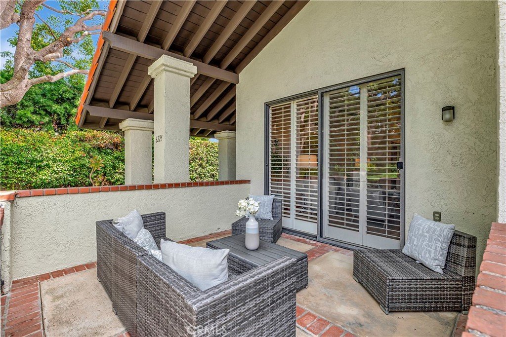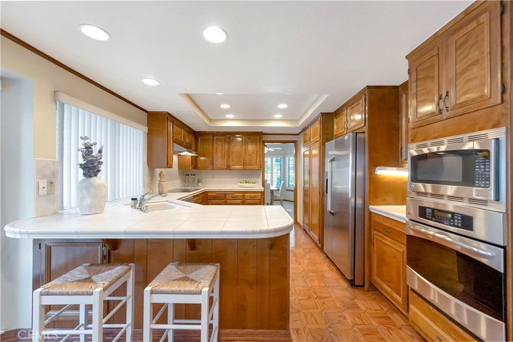 Tucked within a resort-style community called "BIXBY RIVIERA", this beautifully situated SINGLE STORY-END UNIT townhome offers a peaceful PARK-LIKE setting in a PREMIERE LOCATION along the back GREENBELT. Covered side walk-way to double door entry, soaring vaulted ceilings in LR, DR & both BR's. Access to spacious front patio with treetop views from the LR & gas fireplace with dramatic mirrored & wood frame plus mantel. Wet bar with mirror & glass shelves. Kitchen with GE stainless steel appliances, Bosch dishwasher, tile counters, eating area & breakfast bar. Separate inside laundry room with direct access to 2 car attached garage with storage. Spacious en suite primary BR with 3 mirrored closets, bay window & track lighting. BA with soaking tub, separate shower & double vanities. Secondary BR with bult-in shelves & track lighting. Plantation shutters, recessed lighting, central heat & air, carpet, wood and parquet flooring. This is a GREAT OPPORTUNITY as there are only 35 townhomes in the complex!