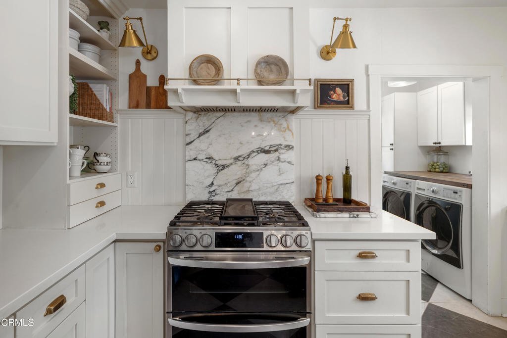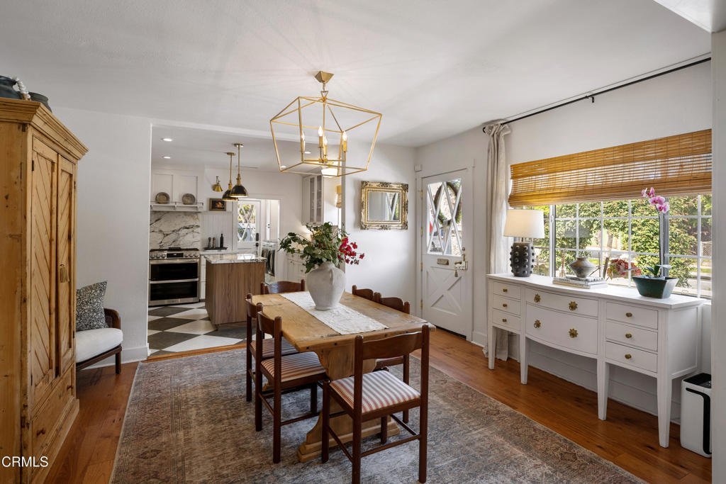 Nestled on a desirable corner lot in Pasadena's charming Normandie Heights neighborhood, this thoughtfully updated Cape Cod-style cottage blends timeless character with clean, modern design. From the moment you arrive, the inviting Dutch front door sets the tone for the warmth and style found within. Inside, hardwood flooring and an open, airy layout create a seamless flow throughout the main living spaces. Dual-pane windows invite abundant natural light, enhancing the home's fresh, purposeful aesthetic. To the right of the entry, the fully remodeled kitchen impresses with oversized tile flooring, a generous island topped with stone countertops, stainless steel appliances, a sleek range hood, custom cabinetry, and designer lighting. Just beyond, a well-designed laundry and mudroom area offers a side-by-side washer and dryer, a convenient folding counter, a charming accent wall with hanging pegs, and direct access to the side patio and detached one-car garage. The dining area, highlighted by a statement light fixture, opens effortlessly to the living room, where exposed wood-beam ceilings add warmth and architectural interest. A large picture window fills the space with sunlight, creating an inviting setting for everyday living and entertaining. Down the bedroom hallway, thoughtful details such as wainscoting and stylish lighting continue the home's cohesive design. A spacious secondary bedroom features hardwood floors, dual-pane windows, a lighted ceiling fan, and ample closet space. The remodeled hall bath showcases a stone-topped vanity, subway-tile tub and shower surround, and penny-tile flooring. A cozy third bedroom with mirrored closet doors sits nearby. At the end of the hall, the primary suite offers a peaceful retreat with hardwood flooring, a lighted ceiling fan, a walk-in closet, and a beautifully remodeled ensuite bath complete with basketweave tile flooring, a stone countertop vanity, and a glass-enclosed shower tiled to the ceiling. Outdoors, the private east-facing yard is framed by tall hedges, creating an ideal space for relaxing, entertaining, or weekend barbecues on the grassy lawn. A brick paver driveway leads to the detached one-car garage, spacious enough for a large SUV and outfitted with storage shelving. Just moments from Pasadena's renowned dining, shopping, and convenient commuter routes, this turnkey Normandie Heights gem offers classic charm, modern comfort, and effortless living in one of the city's most beloved neighborhoods.