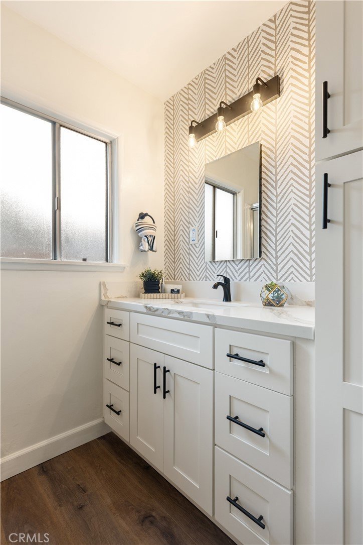 A stylish full bath features lux wallpaper accents, a marbled quartz countertop vanity, and matte black hardware. A separate room off the main hallway works easily as a home office, nursery, or studio.