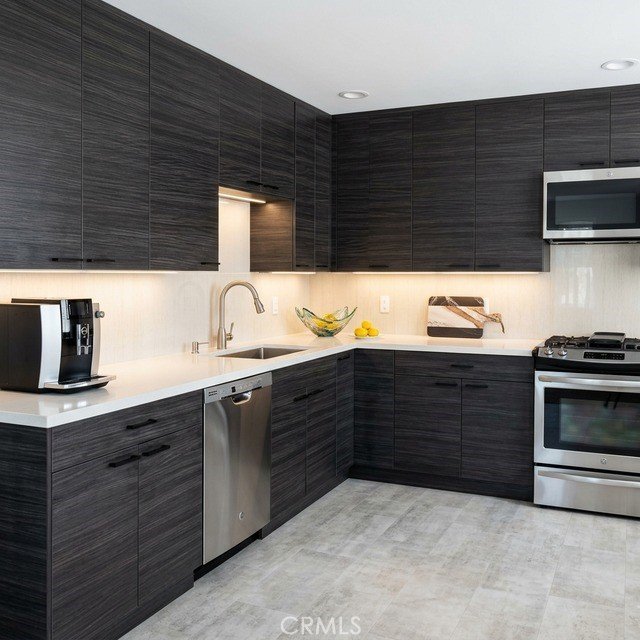 The front unit has been recently remodeled with a stunning modern kitchen featuring sleek dark flat-panel cabinetry, quartz countertops, designer glass tile backsplash, and all stainless steel appliances including gas range, microwave, and dishwasher. Bathrooms showcase elegant marble-look porcelain tile, glass-enclosed showers, and contemporary dark vanities with quartz tops. The remaining three units are also updated with granite counters, newer appliances, and refreshed bathrooms.