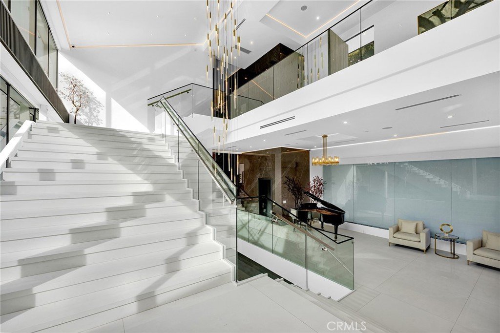 A breathtaking expression of sleek, modern architecture and elevated luxury, this newly constructed gated estate rests along Bel Air's prestigious Billionaire's Row. Beyond the impeccably landscaped courtyard is an extraordinary 20,000 square foot interior, masterfully designed to capture sweeping unobstructed views surrounded by some of the world's most valuable real estate. Created for grand scale entertaining, the seamless multi-level floor plan reveals expansive living spaces defined by dramatic linear fireplaces, soaring ceilings, and walls of automated glass that effortlessly merge indoor and outdoor living.