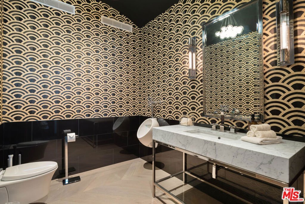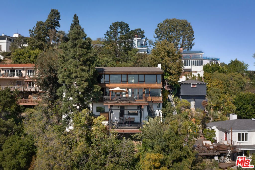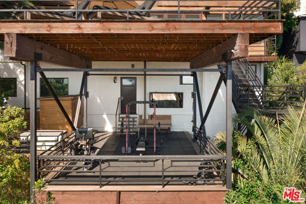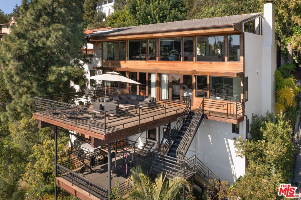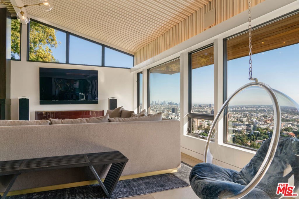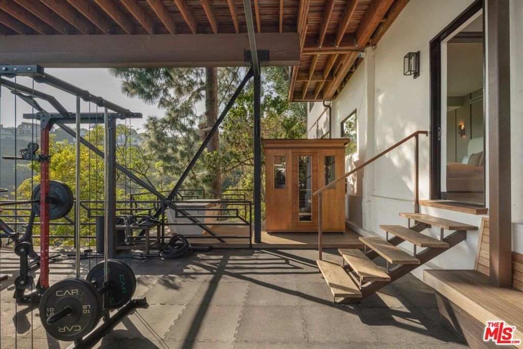 Hollywood Hills Retreat with Designer Finishes and Incredible City Views. On a quiet cul-de-sac in coveted Outpost Estates, this gated and secluded property is a Zen-inspired escape, offering a 3-bed, 5-bath home that has been beautifully updated with luxury hotel-like finishes and approximately 1300 sqft of patio space. Enter home via a bridge over a koi pond and take in the jaw-dropping jetliner views from the floor-to-ceiling windows in the grand living room. The kitchen is a dream for any chef or entertainer, with 54-sqft island, designer display shelving, complete suite of Miele appliances including an induction cooktop, two full-size refrigerators, double ovens, and dishwasher, massive wet bar, and spacious dining area that opens to a shaded patio. On the second level, a game room wet bar, pool table, office space and powder room flows onto a 650-sqft deck. The primary suite features a fireplace, soaking tub overlooking the skyline, dual-head steam shower, and spacious closet. A guest bedroom with ensuite bathroom and separate entrance completes the second floor. On the bottom level, the third bedroom suite with a 250-sqft closet opens to the wellness deck with outdoor gym, cold plunge, and sauna. Fully integrated smart home technology controls music, radiant heated floors, security, and climate throughout. Just a few minutes from the Hollywood Bowl, hiking at Runyon Canyon, iconic nightlight, dining, and shopping on the Sunset Strip and in West Hollywood--LA living at its finest.