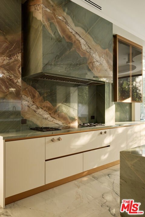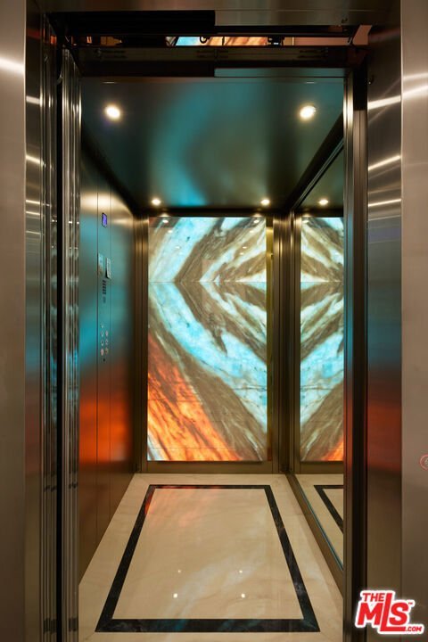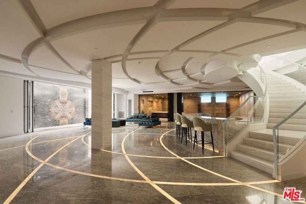 The trophy of the Beverly Hills Flats. A brand new construction 15,000 square foot estate with every amenity imaginable, a true 1 of 1. No expense spared with the most elaborate and finest Italian marbles ever placed in a home, and unparalleled attention to detail. Entry to the main level is through an arched doorway into a double-height rotunda foyer featuring a grand dual-curved travertine staircase. The circular art-glass skylight dome above, in a hand-crafted teal and ivory petal motif, is mirrored precisely in the custom stone floor medallion below, creating a palatial architectural conversation upon arrival. The main level includes two grand-scale great rooms with book-matched marble fireplace walls, a formal dining room, a private executive office, and the custom Versace powder room, fully tiled in authentic Versace Baroque porcelain with a solid-gold freestanding vessel sink, crystal pendant lighting, and a wall-mounted smart bidet toilet. The chef's kitchen is appointed with a champagne-bronze island topped in green onyx, matching onyx backsplash, Gaggenau double ovens, an integrated wine refrigerator, professional range and hood. A secondary prep kitchen is located adjacent. The upper level contains four bedrooms, each designed to the specification of a primary suite with no hierarchy between them. Every bedroom has its own fully appointed ensuite with its own distinct natural stone featuring THG Paris and Baccarat fixtures and mother of pearl inlays, a custom walk-in closet with illuminated glass-fronted wardrobe towers. Two bedrooms open to individual Juliet balconies, and the remaining two share a private sitting gallery with direct access to a terrace overlooking the rear grounds. The lower level unfolds as a dedicated entertainment and wellness floor designed for both large-scale hosting and restoration. A full stone-clad bar anchors the main lounge, which opens through folding glass walls to a secluded courtyard centered around a custom illuminated stone waterfall. A multi-level, cinema-grade theatre completes the entertainment offering. The wellness suite includes a steam shower, cedar dry sauna, and a private indoor plunge pool set beneath a fibre-optic star ceiling. A separate residential staff suite with its own access is also discreetly positioned on this level. The private elevator connects all three floors and is finished in mirror-polished champagne steel with a backlit four-panel amber and teal onyx feature wall and a marble inlaid floor. The rear grounds include a pool, elevated spa, a sunken fire pit seating area, multiple dedicated outdoor lounging and dining terraces, and a custom illuminated stone waterfall wall that serves as the rear garden focal point, equally dramatic by day and night. The property is fully integrated with a Control4 smart home system, seamlessly managing lighting, climate, audio-visual, security, pool systems, motorized walls, and architectural lighting throughout. Estates of this scale, level of finish, and position in The Flats rarely become available, with offerings of this caliber surfacing only a handful of times per decade.