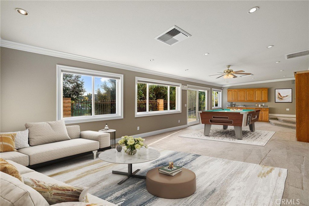 Updated Single-Story Home with Panoramic Mountain Views. Nestled on a secluded hillside lot with ultimate privacy, this beautifully updated single-story residence is accessed via a long, private driveway that opens to an extra-wide front motor court. Double wood-and-glass entry doors welcome you into a bright foyer with tile flooring that flows seamlessly into the expansive open-concept living areas. The dramatic family room showcases vaulted ceilings, a wall of picture windows framing sweeping mountain views, a bay window overlooking the front yard, and complete openness to kitchen. The kitchen features classic white shaker cabinetry, stainless steel appliances, recessed lighting, hardwood flooring, and a peninsula with casual countertop seating. Adjacent to the family room is a well appointed wet bar equipped with a sink, under-counter refrigerator, glass-front upper cabinets, and a curved radius counter perfect sitting and entertaining. The formal living room serves as a stunning focal point with its floor-to-ceiling Roman-brick fireplace and raised hearth, recessed lighting, elegant crown molding, and an expansive picture window. A versatile bonus room (easily convertible to a fourth bedroom) includes a dry bar that could be transformed into a kitchenette, crown molding, and sliding glass doors opening to the backyard. Down the hallway, the generously sized primary suite offers carpeting, direct access to a private balcony showcasing beautiful mountain views. The primary bathroom includes a glass-enclosed walk-in shower, a soaking tub with marble surround, dual-sink with a dedicated vanity, and a walk-in closet with built-in organizers. Two additional bedrooms feature ceiling fans and plantation shuttered windows, while the well-appointed hall bathroom includes dual sinks, a shower/tub combination with sliding glass enclosure, and a view window. Convenience is elevated with an oversized laundry room offering a folding counter, abundant built-in storage cabinets, hanging rod, and a built-in cabinet ironing center. Exterior grounds are designed for low-maintenance living, featuring drought-tolerant gravel landscaping, stepping stones, concrete walkways accented with brick ribbons, a grassy play area, and a convenient storage shed. There is a solar system that will be transferred to the new buyer on lease that began in 2012. This thoughtfully updated home combines mid-century character with modern amenities and unparalleled panoramic views throughout.