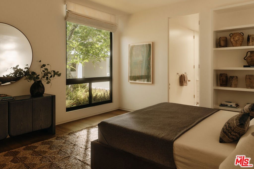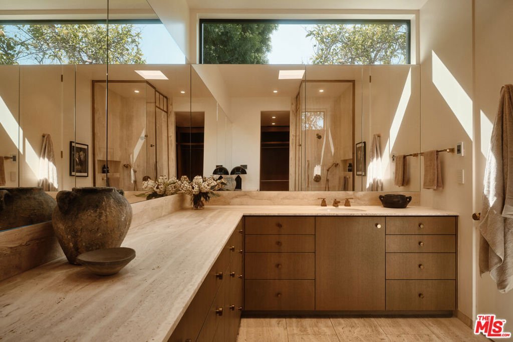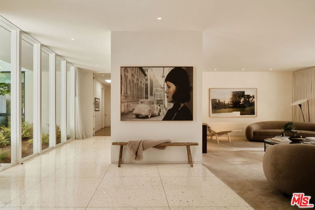 Discreetly nestled behind gates sits this light and bright iconic one-story mid-century home situated on a spectacular 27,800 sf lot. Designed in 1961 by Daniel Dworsky, the man behind Bradley's International Terminal at LAX, UCLA's Drake Stadium and the Federal Reserve Bank in Los Angeles. This flawless floor plan with high ceilings throughout was gutted and reimagined by Waldo Fernandez and has all the finishes appropriate for today's lifestyle. A double-door entry welcomes you into this 4-bedroom, 5-bath home, plus an attached gym/guest room. Floor-to-ceiling glass flanks the formal dining area, and the original double-sided fireplace anchors the living room and family room. Great walls for art, open floor plan, and terrazzo and hardwood floors compliment this extremely rare offering. A separate full bar and gourmet kitchen are perfect for large scale entertaining. Walls of glass overlook a park-like backyard, stunning pool, and outdoor kitchen.