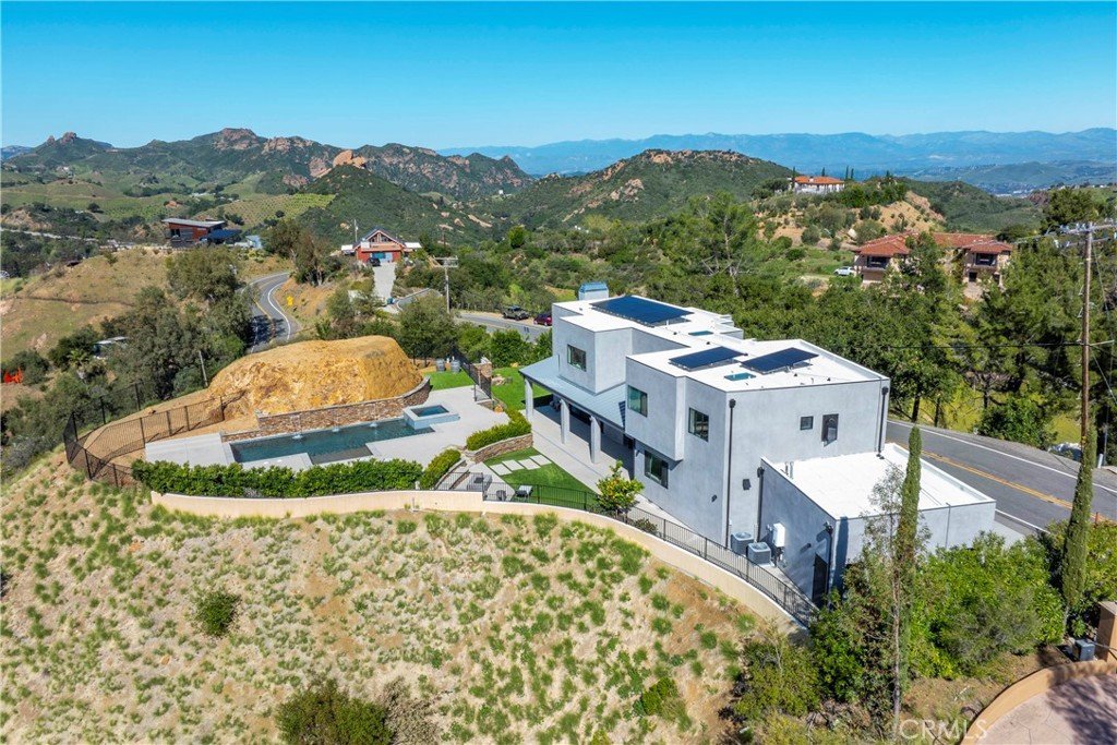 Experience the pinnacle of Malibu Modern living in this stunning 3-bedroom, 4-bathroom architectural masterpiece built in 2021. Perfectly situated to capture breathtaking panoramic canyon and mountain views, this home offers a sensual flow designed for seamless indoor-outdoor entertaining. The interior features exquisite French oak flooring and soaring high ceilings, anchored by massive Fleetwood sliding glass doors that invite natural light throughout. A gourmet chef’s kitchen comes equipped with a premium Wolf Range, Sub-Zero refrigeration, and Miele appliances. A true standout feature is the newly installed Tesla solar panel system with a backup battery, offering the incredible benefit of virtually no electricity costs and uninterrupted power during local outages. Retreat to your private backyard oasis, complete with a sparkling pool and tranquil waterfall feature. Located just minutes from iconic destinations like Cielo Farms and Malibu Wine Safari, and approximately 5 miles from Zuma Beach. This is the ultimate energy-efficient Southern California lifestyle retreat.