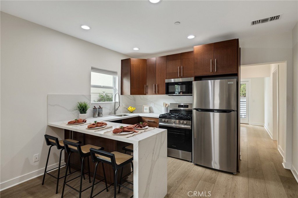 Welcome to 724 San Miguel Ave, a beautifully updated single-family home nestled in the vibrant heart of Venice. Just a short walk from the iconic Abbott Kinney Blvd and the stunning Venice Beach, this residence offers the perfect blend of charm and modern convenience. This recently renovated 3-bedroom, 3-bathroom home boasts a host of upgrades, including new quartz kitchen countertops, state-of-the-art kitchen appliances, a brand-new HVAC system, and elegant engineered hardwood floors. The interior and exterior have been freshly painted, complemented by recessed lighting throughout. Upon entering, you'll find an open-concept living area that seamlessly connects the kitchen and living room. The entry-level features two bedrooms, each with large walk-in closets and dual-pane windows that flood the rooms with natural light. The back primary bedroom includes an en-suite bathroom and opens up to a private backyard patio and charming yard. Additional storage is available in the spacious attic, easily accessible via a pulldown ladder. Upstairs, discover a bright and cheerful third bedroom with its own en-suite bathroom, ample closet space, and a private porch—perfect for enjoying your morning coffee. Outdoor enthusiasts will appreciate the ultra-private fenced-in yard with multiple areas for entertaining. Parking is convenient with space for two cars in tandem in the driveway and additional street parking available. Don't miss your chance to own this stunning home in one of Venice's most sought-after locations. Schedule a viewing today before it's SOLD!