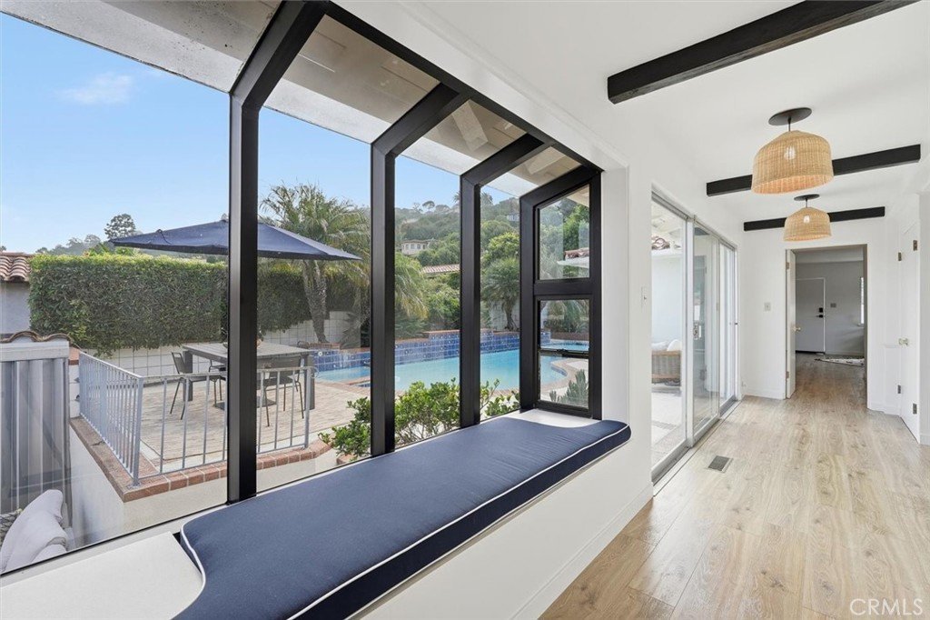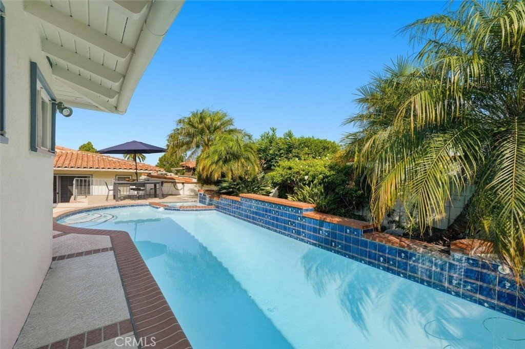 Outdoors, a private backyard with a pool and spa creates a sanctuary of its own — perfect for quiet mornings or afternoons spent entertaining under the Palos Verdes skies. Mature landscaping softens the edges of the home and enhances its sense of privacy, while city lights and peek-a-boo ocean views remind you just how special this hillside location really is.