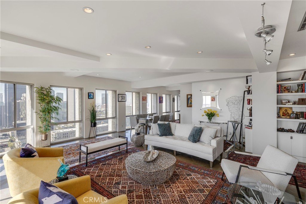 Perched high above the city on the 23rd floor of prestigious Bunker Hill Tower, Residence 2305 offers elevated downtown living with sweeping skyline views, abundant natural light, and a sophisticated urban atmosphere. This exceptional residence has been thoughtfully designed and curated, with its layout, décor, and furnishings selected under the guidance of a highly regarded interior design artist, who carefully tailored each element to complement the proportions and flow of the unit. Every furniture piece was handpicked for scale and harmony, creating a rare sense of balance, comfort, and visual refinement throughout the home. Adding to its uniqueness, much of the designer-selected furniture and custom-curated artwork may be included with the sale, offering a truly move-in-ready opportunity with an elevated aesthetic rarely found in condominium living. The spacious floor plan is ideal for both entertaining and everyday comfort, with expansive windows framing dramatic city views, generous living and dining spaces, and seamless circulation throughout.