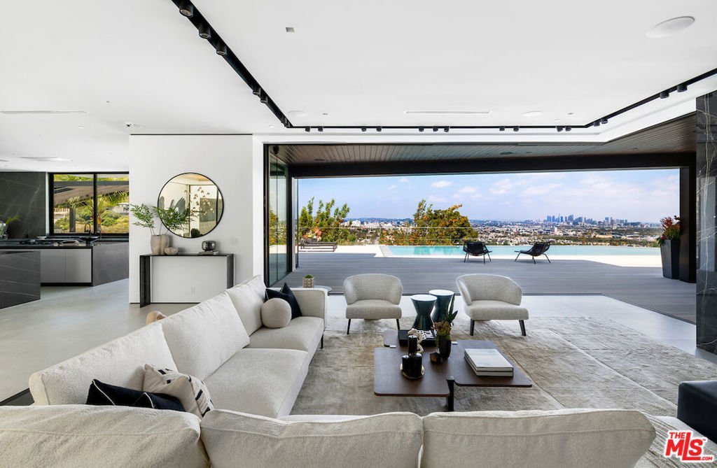 Situated in a prime lower hillside location above the renowned Chateau Marmont, this newly constructed residence offers the epitome of luxury Los Angeles living. Past a double gated motor court, the home's modern steel, stone, and glass facade opens to a truly luxurious interior created by award-winning Nathalie M Designs that is filled with disappearing walls of glass, architectural clean lines, European Oak Wire Brushed floors, 6,399 square feet of deck space, and thoughtful high-end finishes. A functional open layout includes the main living area, grounded by an impressive stone fireplace, and grand dining area, both intended to take in the uninterrupted skyline views. A contemporary dual island kitchen with a secondary dining area sits open to both the main living and dining areas, outfitted with custom two-tone cabinetry, beautiful shadowy stone waterfall surfaces, and seamless top-grade appliances. A designer butler's pantry, guest powder room, secondary ensuite bedroom, and car gallery round out the main level. Sliding glass walls pocket seamlessly from the main living area for uninterrupted access to the outdoor deck and picturesque zero-edge pool with spa, designed with intricate tiles and a relaxing shallow sundeck. Glass railings allow for every opportunity to take in the views, while a covered lounge area and bar-edged outdoor kitchen provide ample entertainment areas. The upper level of the home includes the dazzling primary suite, crafted with a stunning stone-facade fireplace, purposeful wet bar, substantial custom closet, a stone-wrapped spa grade bathroom, and of course, glass pocket walls to access the private patio and take in the incredible views. A plush lounge area, outdoor patio, and three secondary bedrooms all featuring ensuite designer bathrooms and some including private outdoor spaces, complete the top floor of the residence. Accessed via floating staircase from the second level outdoor patio, or interior elevator which is accessible to all floors and rooftop, the pinnacle of the property features an expansive rooftop deck, outfitted with a full outdoor kitchen, gas firepit, and glass railings for an epic vantage point. At the lower level of the home, a secondary living area contrasts sleek white walls with a magnificent book matched stone fireplace and entertainment area, ultimately leading to two additional secondary bedrooms with designer ensuite bathrooms, a plush galaxy-ceiling theater, designated laundry room, and resort-level spa, complete with oversized soaking tub, glass enclosed shower, and stone steam room. Additional aspects of the home include a second garage, intricate lighting to accent key architectural features, a state-of-the-art surround sound system, top of the line smart home technology, and an impressive fully equipped home security system.