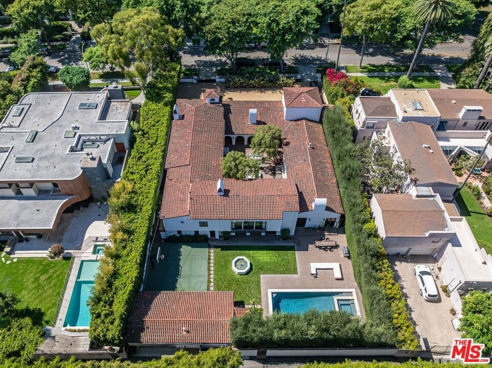 Immortalized on the cover of Architectural Digest and published in several editions, this rare Spanish Colonial on iconic Roxbury Drive in the Beverly Hills Flats offers 6BD, 9BA and effortlessly blends timeless architecture with modern sophistication. Originally designed by Ralph Flewelling, FAIA, the approx. 8,434 SF residence has been exquisitely updated to preserve its historic elegance while introducing contemporary comforts. Archways, soaring truss ceilings, wrought-iron accents, and hardwood and terracotta floors create a dramatic yet inviting atmosphere.The main living spaces open to a serene central courtyard with sitting areas and fountain, while a grand entry hall doubles as a stunning library with groin-vault ceilings. Formal living and dining rooms, a den/media room, office, and a spectacular kitchen with adjoining great room provide ample space for both entertaining and everyday living. Two guest bedrooms on the main level are complemented by four upstairs, including a majestic owner's suite with fireplace, dual baths, and balconies overlooking the courtyard and grounds.Outside, lush landscaping frames multiple seating and dining areas, a sparkling pool and spa, sports court, and a charming guest house, offering the perfect blend of privacy and resort-style living. A legacy property where Hollywood glamour meets modern luxury. Now is your opportunity to become part of the impeccable pedigree of ownership.