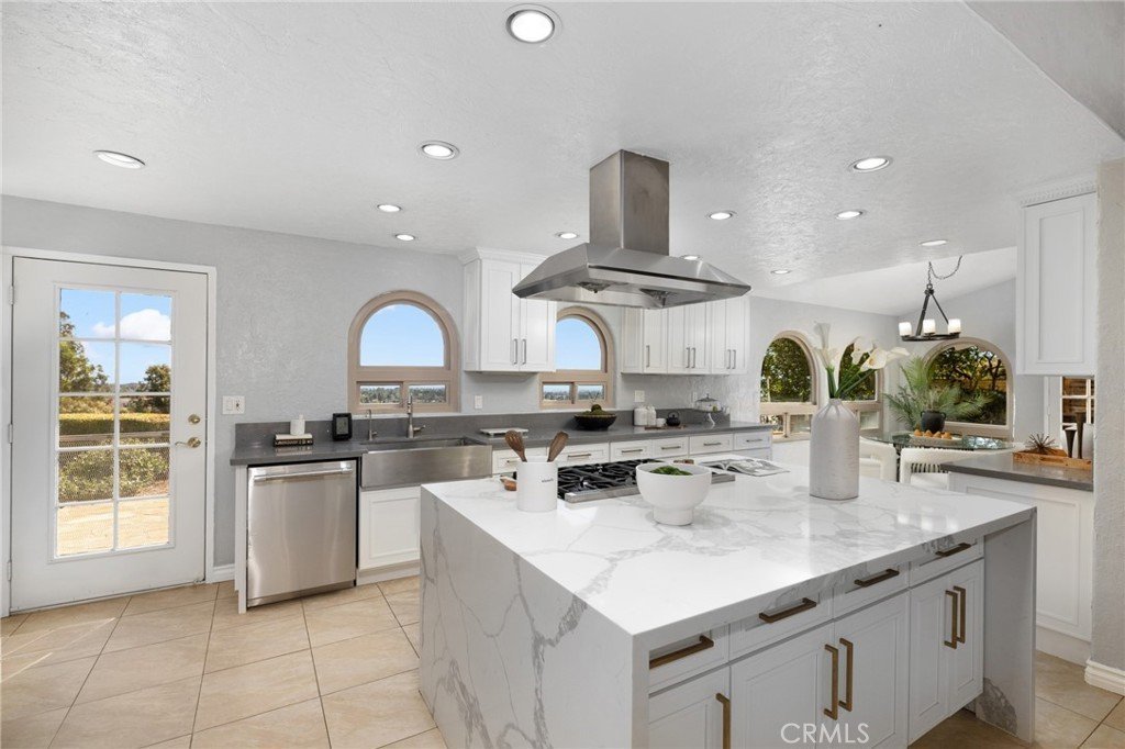 Double leaded-glass entry doors open to a dramatic foyer with soaring ceilings and an open, flowing floor plan filled with natural light. Formal living and dining areas are framed by walls of windows and enhanced by rich architectural details, including wood-beamed ceilings, decorative niches, and multiple fireplaces. The spacious great room features skylights and French doors that seamlessly connect indoor and outdoor living. The remodeled kitchen showcases an oversized quartz island and premium Thermador appliances, opening to a breakfast nook and family area—all positioned to capture the home’s stunning views.