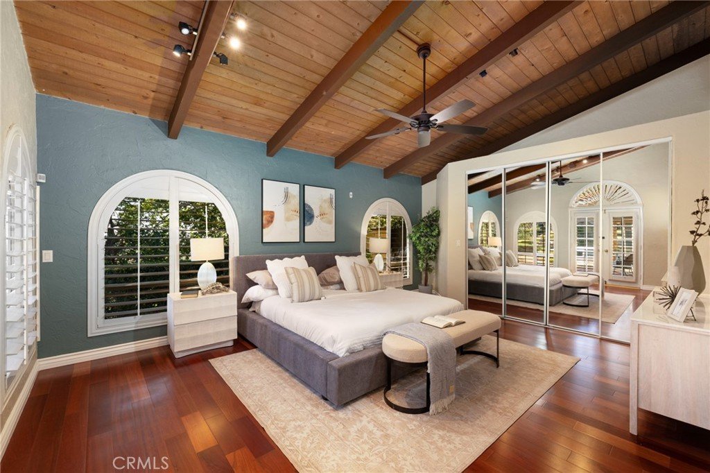 The primary suite opens to the private courtyard with relaxing jacuzzi. The expansive grounds feature multiple patios, built-in barbecue, and beautifully landscaped front and back yards with mature fruit trees and edible plantings, creating an inviting garden-to-table lifestyle. A large flat grassy area offers ample space for recreation, gatherings, or future expansion, with potential for additional structures such as a guest house, casita, or private retreat.