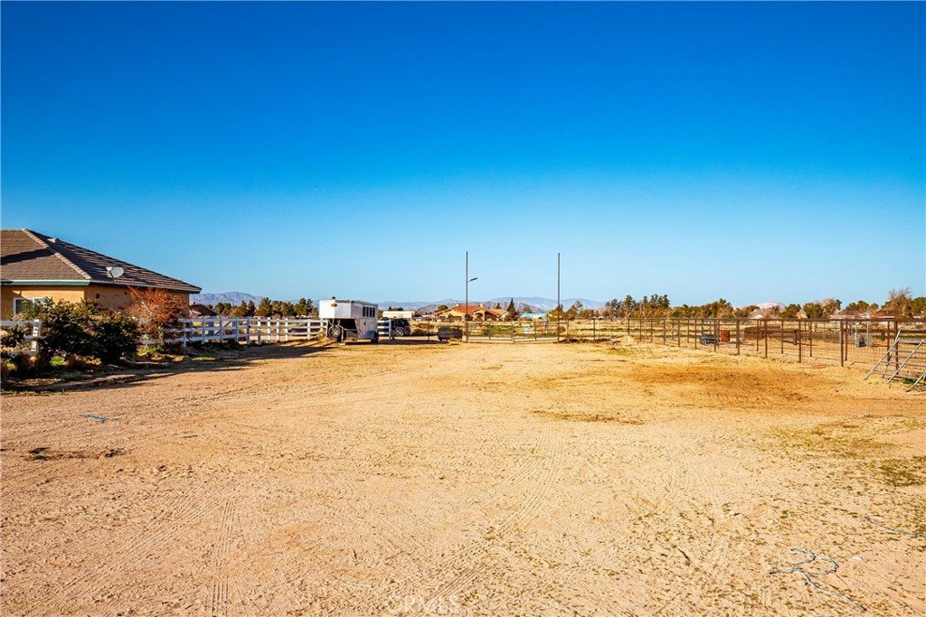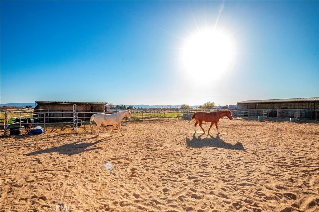 Your search for a functional ranch in the desirable Antelope Acres West Lancaster area with extensive livestock/horse facilities is over. You have found it! Welcome to your own private ranch oasis with a lovely single-story home on 2.5 acres of flat useable land, fully fenced, featuring an easy 10-horse capacity comfortably! The home is a wonderful single-story, 4&2, plus the garage has been converted into an additional living space with ceiling fan, and private entrance door (seller will leave panels for buyer for easy conversion back to garage, if desired). As you approach the covered entry to the home, you will notice a large formal dining room on your right, bedroom or office to the left, plus a huge living room with beautiful French doors leading to your private back yard, and lovely green sodded area. The kitchen has tile countertops, ample cabinets, and opens to the living room and additional dining area. The home features Mahogany doors throughout, plus Knotty Elder cabinetry. The master has a large ensuite with soaking tub, separate shower, dual-sink vanity, and a walk-in closet. There is a large separate laundry room, and all appliances are included with the home. The ranch facilities are extensive (rare for the area) including a 30’x 90’ six-stall barn with turnouts (with electricity), additional 2-stall shelters, pig pen, goat pen, plus a football field size arena (280’ x 160’) which includes chute & boxes, an additional shelter, plus a 15-foot alleyway. In your backyard you have another large fenced turn-out area for horses or livestock, plus a huge open yard for your favorite toys such as RV parking & off-road vehicles. Automatic sensor lights are included in the exterior of the home, plus a solar-powered light on the main gate. The home also features full fencing around property, and concrete tile roof. Water is provided by the local Lands Project Mutual Water utility company, and there is a local town center minutes away which includes restaurants, feed/hardware store, country market with gas station & food counter, plus your own local fire station and community center. Just ½ hour drive to Lancaster or Palmdale, it doesn’t get much better than this! The sellers are the original owners/builders, and this property reflects pride of ownership! Come and check out this amazing all-inclusive ranch property today!